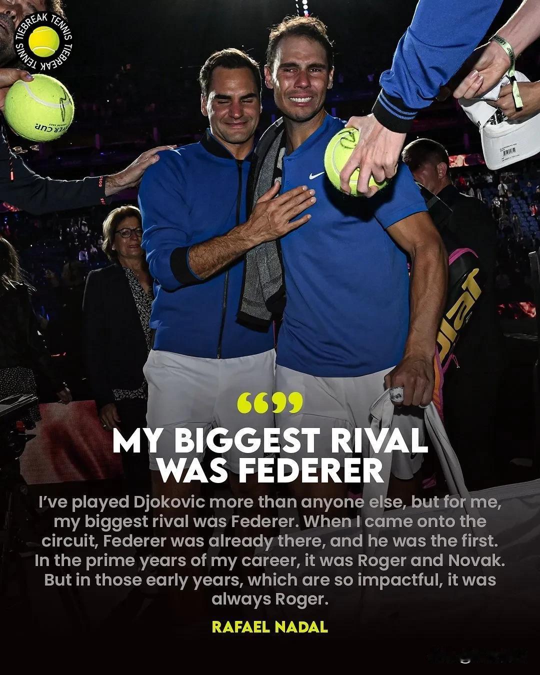 纳达尔谈到对他的两个伟大对手的评价: 费德勒:是最大的对手。我和德约科维奇对决最多,但是在我心目中我最大的对手是费德勒。当我踏入赛场时,费德勒已经在那了,他是世界第一。在我主要的职业生涯中,有费德勒和德约科维奇。但是在最初的几年,最具影响的那个人,一直是费德勒。 德约科维奇:最好的(球员)。他是一个能够每年都能够保持很高的水平并在提升的球员。他的排名显示了他是最好的球员,他的网球也是最好的。他的不轻易受伤,让他可以在体力和精神上比别人保持更好的状态打网球,他是最好的球员。