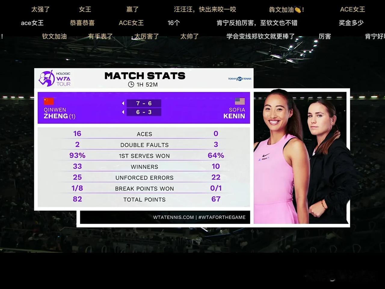 #WTA500# 东京站,恭喜郑钦文不负众望,获得冠军。头号种子赢得冠军,捍卫了自己的地位。 昨天她的对手肯宁哭着伤退双打,以为对今天的单打有影响。实际是她在第一盘给郑钦文制造了很大的考验,不像有伤的样子。不过郑钦文以16个Ace球和高达93%的一发成功率,第一盘抢七成功,第二盘6:3,将优势保持到了最后。 经过巴黎奥运冠军的成绩洗礼,郑钦文的自信心和稳定性在增强,美网八强,中网4强,武网亚军,到东京冠军,一路走来一直在稳稳地进步。 年终赛再见👋