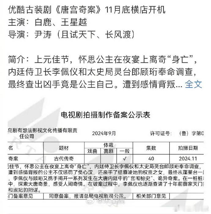 #白鹿王星越三搭唐宫奇案已备案# 白鹿王星越三搭唐宫奇案已备案, 11月底横店开机。期待期待,蹲一波官宣 !#白鹿王星越三搭合作#