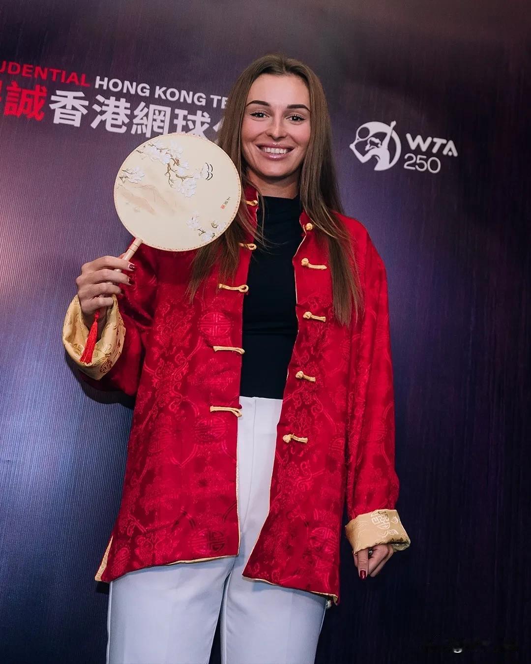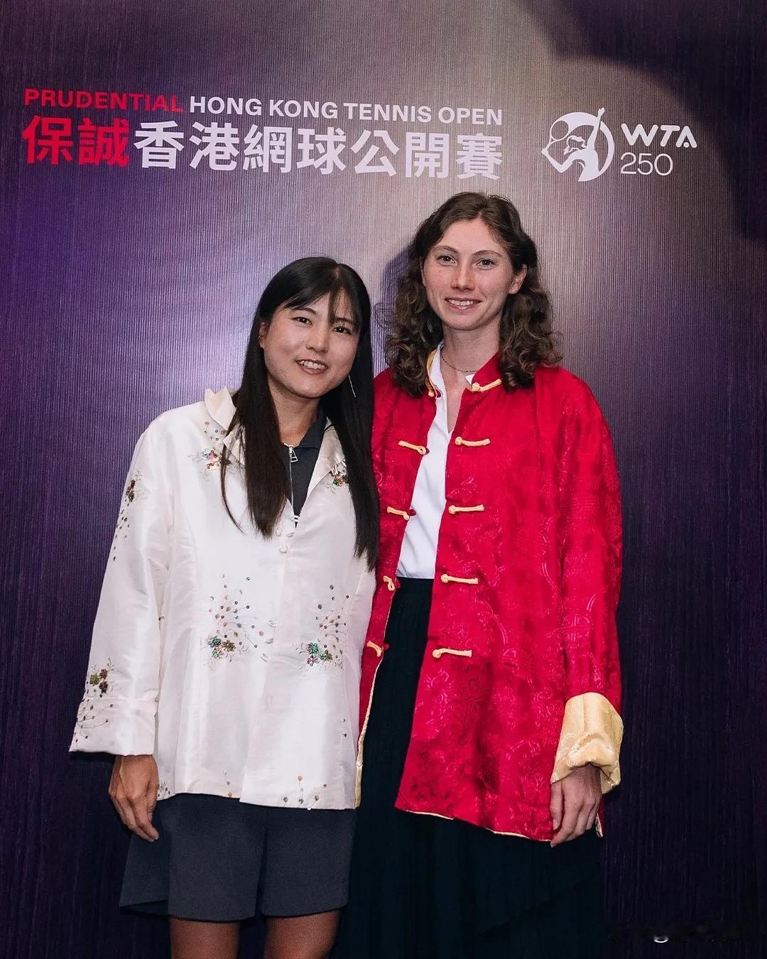 #WTA250# 香港站开幕酒会的物料,外国球员穿上了中式服装。感觉这种款式对于来老外更易接受,穿脱方便,在日常生活中穿也不显突兀。很好的文化宣传,这些球员每一年来中国打比赛,要让她们渐渐爱上汉服[大金牙]。