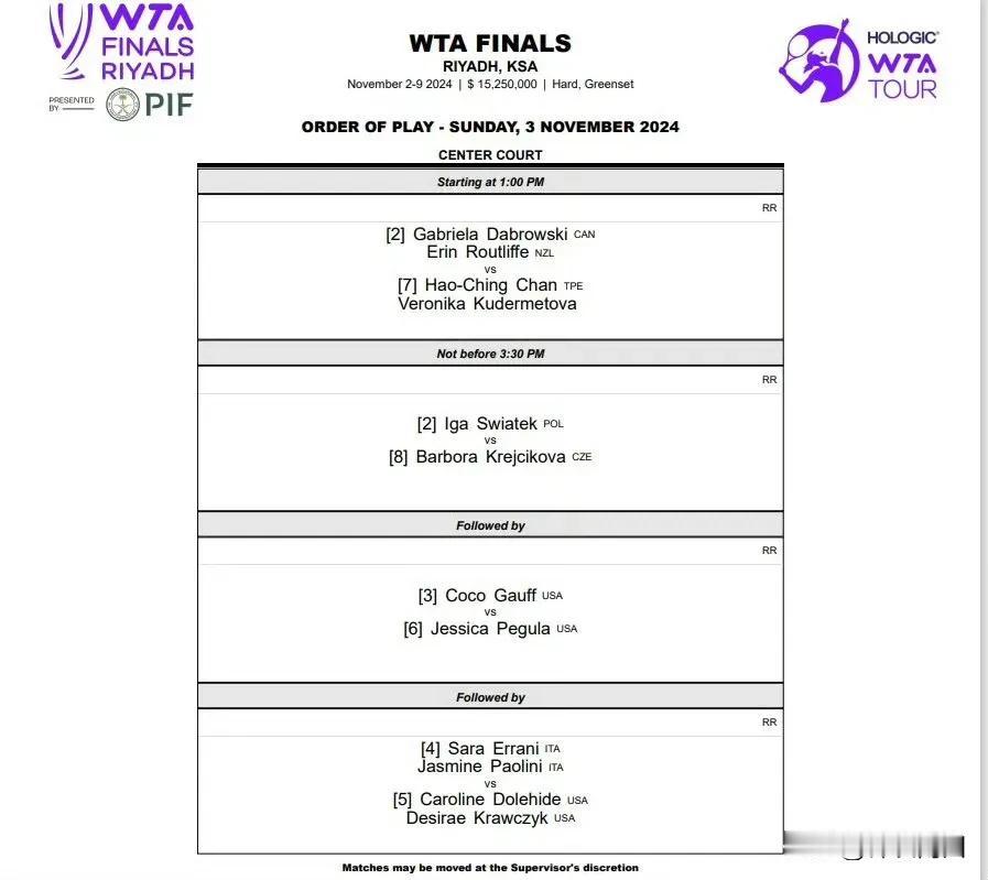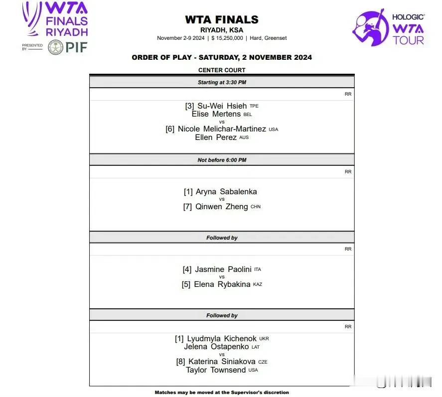 #利雅得WTA年终总决赛# 11月2日,3日赛程出来了。郑钦文第一场打萨巴伦卡。不要怕,不要急,加油[加油加油]! 2号赛程: 20:30 女双小组赛 谢淑薇/梅尔滕斯🇧🇪 vs 梅里查尔🇺🇸/佩雷斯🇦🇺 23:00 女单小组赛 郑钦文🇨🇳 vs萨巴伦卡🇧🇾 00:30 女单小组赛 保利尼🇮🇹 vs 莱巴金娜🇰🇿 02:00 女双小组赛 基切诺克🇺🇦/奥斯塔彭科🇱🇻 vs 斯尼亚科娃🇨🇿/汤森德🇺🇸