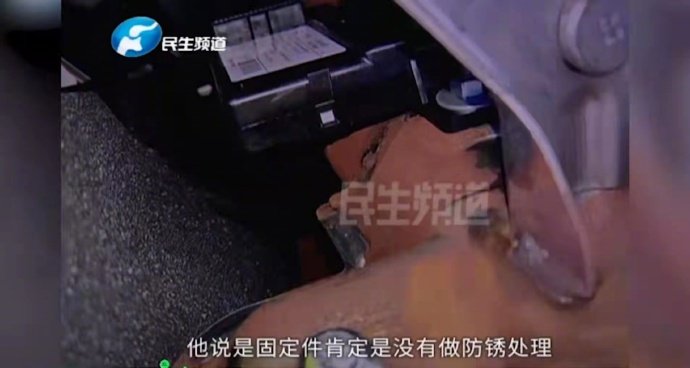 销售经理说,这是技术问题,他也不太懂。记者问,是汽车出厂的时候就是这个情况,还是有其它因素呢?经理说,质量没有问题,肯定就是固定件没做防锈处理。