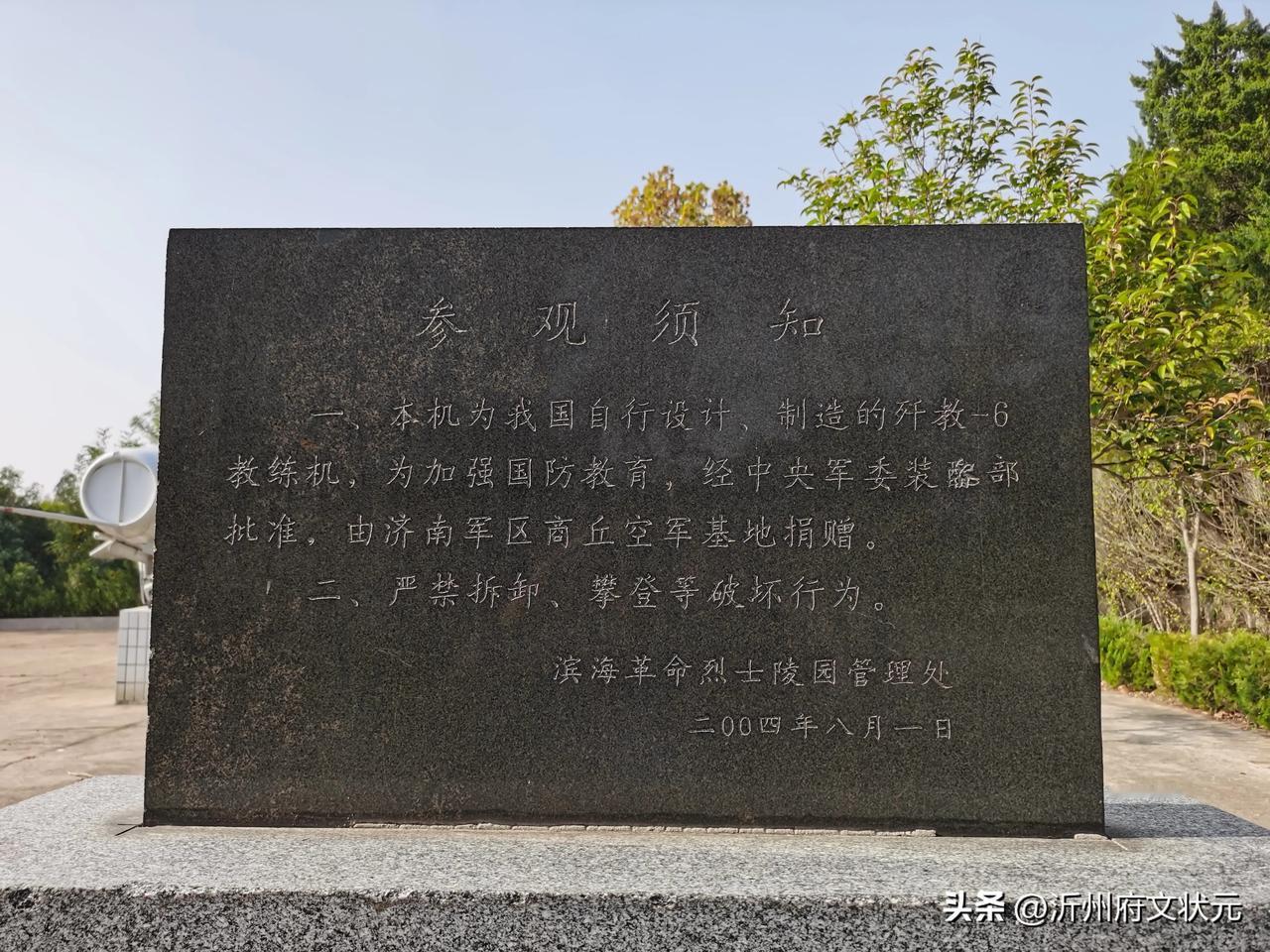 临沭竟然有歼击机! 在山东省临沭县滨海革命烈士陵园内,有一架我国自行设计、制造的歼教-6教练机,为加强国防教育,由中央军委装备部批准,由济南军区商丘空军基地捐赠到陵园。滨海革命烈士陵园现为全国爱国主义教育基地。有革命烈士纪念碑、纪念塔、无名烈士墓、一一五师纪念亭等纪念设施。陵园仿照南京中山陵依山而建,是鲁东南规模较大的革命烈士纪念地。 大美临沂临沭 临沂