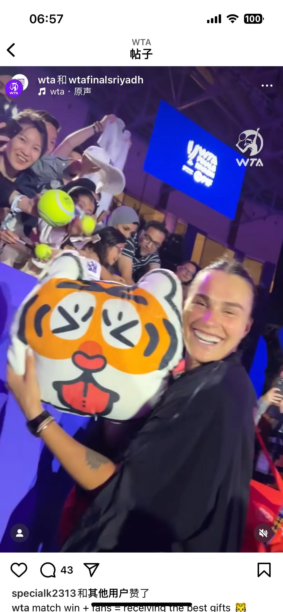 萨巴伦卡小组第一出线🔝 #利雅得WTA年终总决赛# 紫组第二轮小组赛,萨巴伦卡以6-3 7-5击败保利尼,以小组第一出线,连续三年晋级年终四强。这也意味着莱巴金娜无缘出线。 保利尼打得真不错,以柔克刚。在第二盘坚持到抢7局,真是尽力了。 下一场小组赛保利尼对郑钦文,将会非常关键,谁赢了谁将以小组第二出线。 想说萨巴伦卡在场上的叫声对她的对手是一种精神摧残,对方一旦落下风,越听越气有没有。至少作为观众,听的心烦[打脸][笑哭]。 有个粉丝送给萨巴伦卡的虎头靠垫可爱的,以后萨巴伦卡会有一屋子的虎头周边😄。粉丝爱送,还记得中网的虎头🐯帽否。