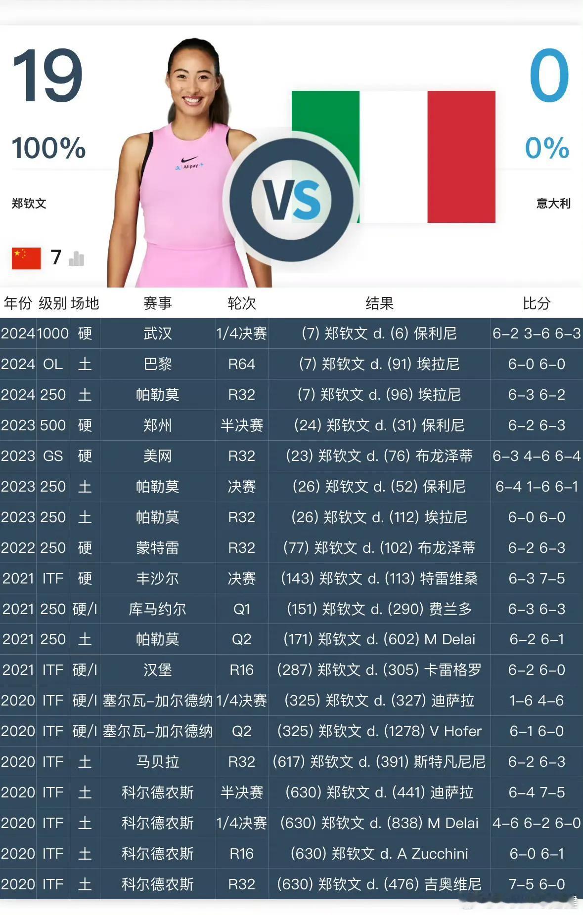 郑钦文小组出线🔝 #利雅得WTA年终总决赛# 紫组第三轮小组赛,郑钦文以两个6:1击败保利尼,小组两场胜利确保小组出线。 赛点一记Ace球完美结束比赛,郑钦文笑了,保利尼一脸的落寞。郑钦文场上一共轰出12个Ace,完美。 郑钦文打保利尼有心得,看她与保利尼的保利尼过去19场的比赛,保利尼没有赢过一次,算上今天,一共20连败。保利尼遇上苦主了,被克的死死的。 郑钦文今年是第一次进入年终总决赛,出线就是赚到。四强中如果另外三个是高芙、斯瓦泰克、萨巴伦卡,她们都比小郑排名高,都打过不止一次总决赛,都有大满贯单打头衔,小郑没压力。就当澳网前的以赛代练。 好好享受接下来的比赛[鼓掌]。