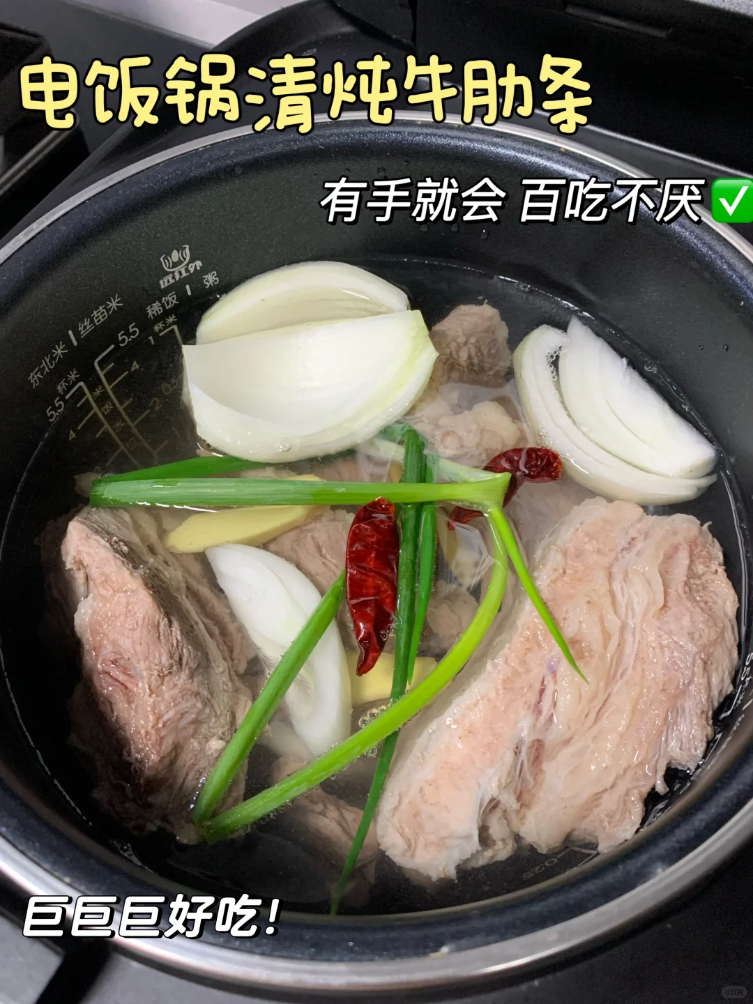 买牛肋条、给它清洗浸泡、焯出血水、电饭锅开炖