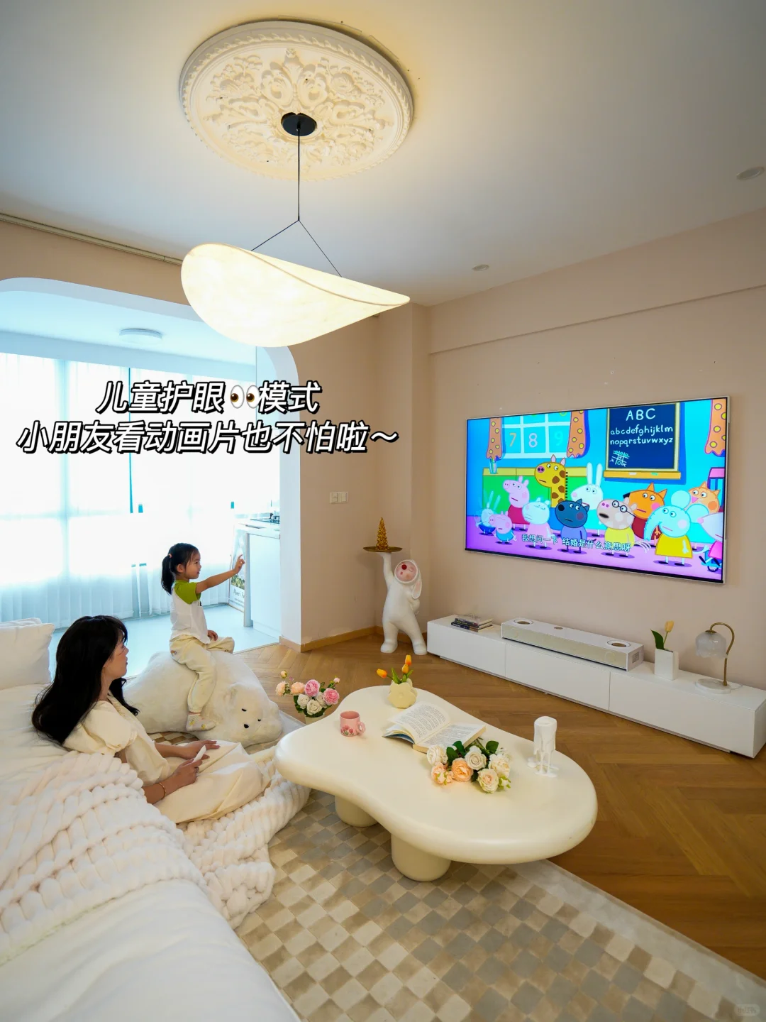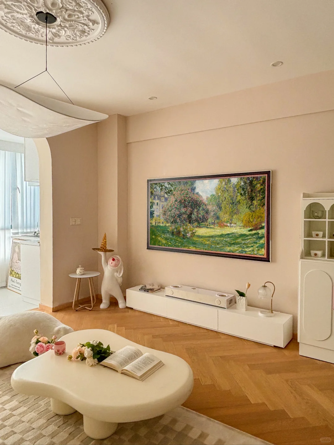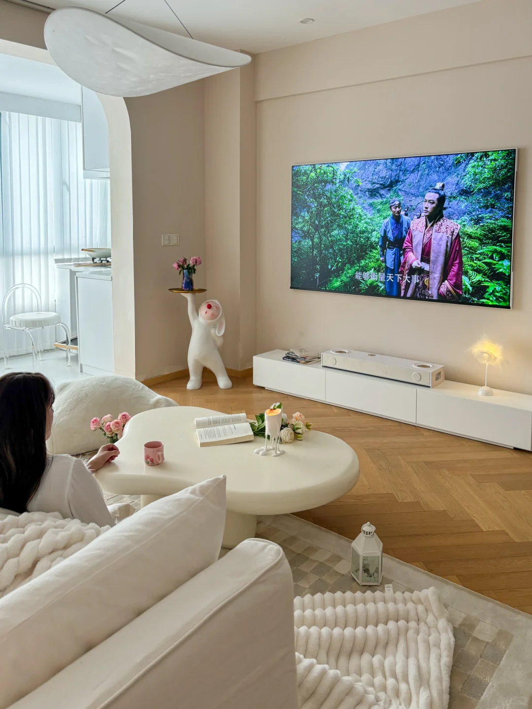 给自己留一片独自冥想和思考的天地,心是自由的 很庆幸,我的小窝是依照自己的想法,一寸一寸打造出来的~ 住在自己亲手打造的家里面🏠 确实是把自己舒服住了☁️ 每天哪怕是什么都不做,只在客厅里面休息休息,看看外面的风景都会觉得很惬意~ - 原本我是以为自己家23平的客厅空间略微有一点小的~ 结果打造的时候竟然DIY出了这么温馨的模样❤️! 原木色的色系配上白色的软装~ 就像是一杯热可可里面融入了一点奶霜, 特别治愈! - 我家客厅之前配的是小电视,怎么看都不对,自打换了白色的75吋的创维壁纸电视Q8E✅家都高级多了。 无缝贴墙➕珠光白的外观,可以让它美好的像一幅画一样,早上起来的时候看到这样子的画面,我都有点舍不得打破这样的氛围了! - 它的系统内置了免费200+世界名画供选择~ 还是类纸屏的设计,0反光,0眩光 会根据环境自动调整亮度~ 能够真实还原画作的纹理和质感~ 这个感觉就有一种,我在画廊里面看画的错觉🌈! 随手合拍❤️都特别有感觉! - 配合上同款珠光白独立主机的哈曼影院系统4.2☁️ 我感觉自己的耳朵都像是得到了洗礼一般~ 每天拖地的时候开着电视机,听听音乐,心情都能好上不少! - 它还配了酷开AIOS🉑 能够直接进行语音操控,而且还能够利用AI完成大师作画~ 雨后如果看到外面有一道美妙的彩虹🌈 我也可以立刻让这个电视机画出来,当成壁纸用🍉 这不也是人生的另一种小确幸吗? - 🛋:白色沙发 为了迎合珠光白的电视机,我家的沙发也换上了白色的外套,很漂亮! ☁️茶几:云朵茶几也是白色的,看上去奶fufu的 地毯:甚至家里的地毯都挑了奶油白色系的~虽然难打理,但确实是很有氛围感👍 如果你们也喜欢这样子,氛围感的小家,赶紧配上同款~ 让客厅充满艺术气息吧! -