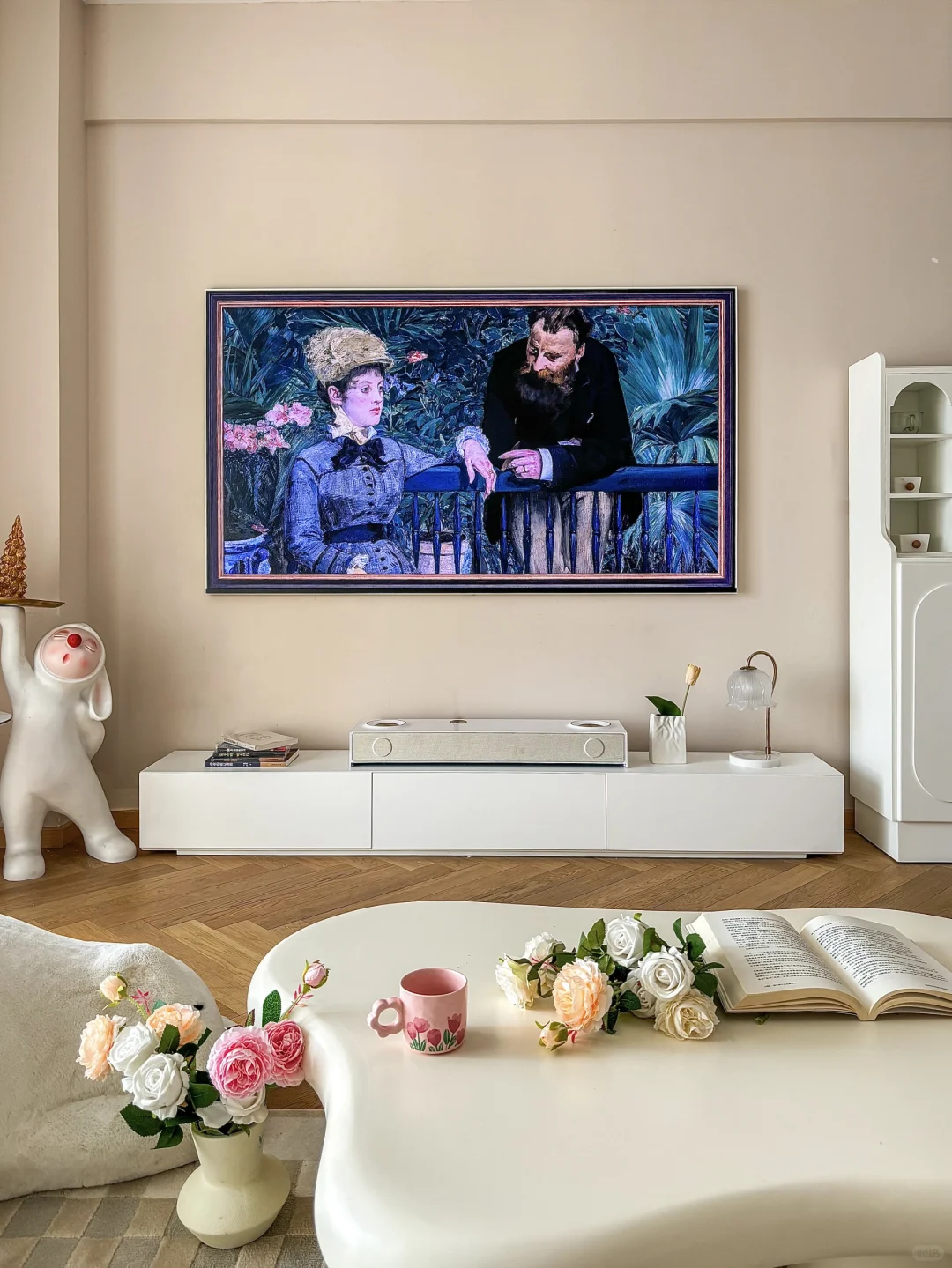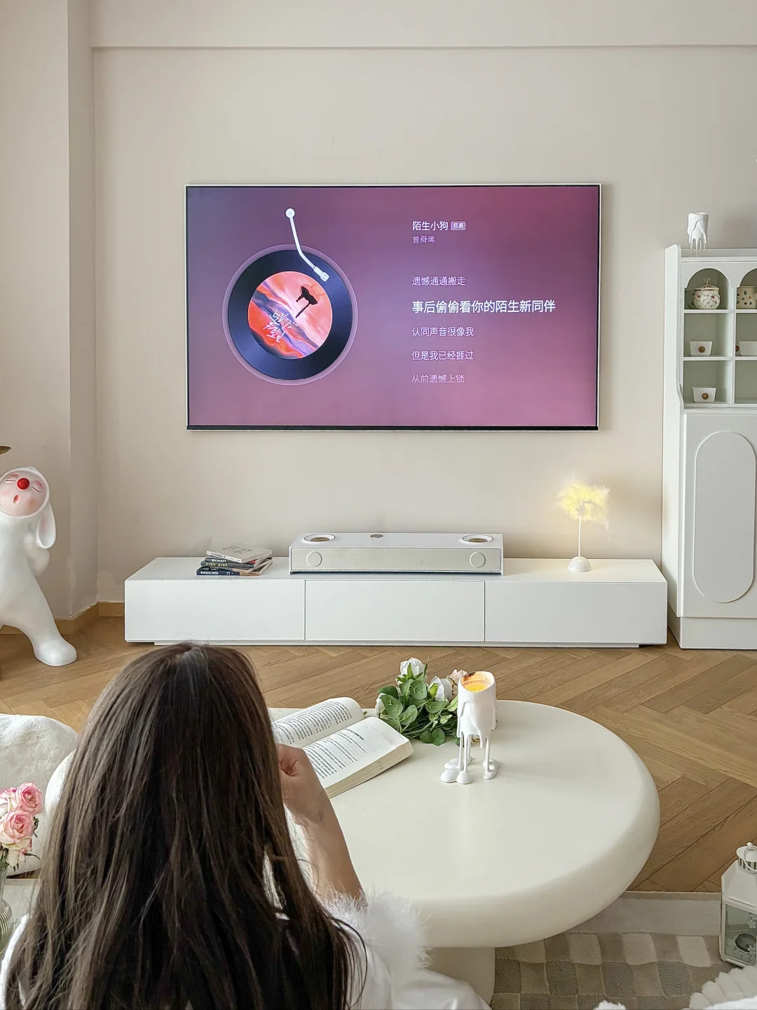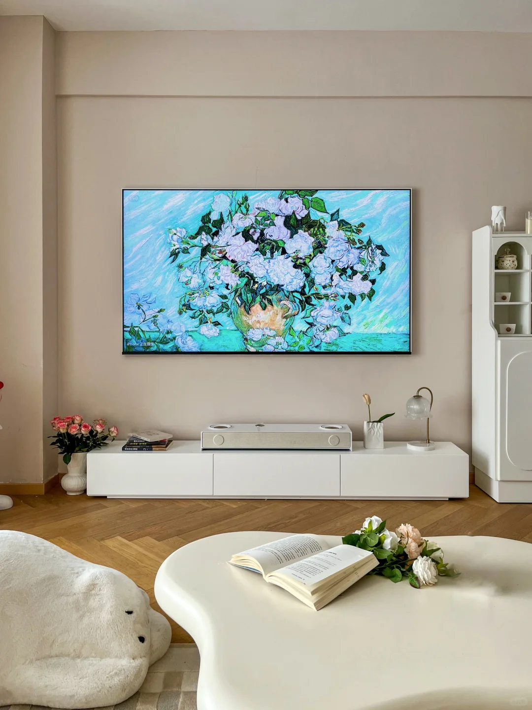 给自己留一片独自冥想和思考的天地,心是自由的 很庆幸,我的小窝是依照自己的想法,一寸一寸打造出来的~ 住在自己亲手打造的家里面🏠 确实是把自己舒服住了☁️ 每天哪怕是什么都不做,只在客厅里面休息休息,看看外面的风景都会觉得很惬意~ - 原本我是以为自己家23平的客厅空间略微有一点小的~ 结果打造的时候竟然DIY出了这么温馨的模样❤️! 原木色的色系配上白色的软装~ 就像是一杯热可可里面融入了一点奶霜, 特别治愈! - 我家客厅之前配的是小电视,怎么看都不对,自打换了白色的75吋的创维壁纸电视Q8E✅家都高级多了。 无缝贴墙➕珠光白的外观,可以让它美好的像一幅画一样,早上起来的时候看到这样子的画面,我都有点舍不得打破这样的氛围了! - 它的系统内置了免费200+世界名画供选择~ 还是类纸屏的设计,0反光,0眩光 会根据环境自动调整亮度~ 能够真实还原画作的纹理和质感~ 这个感觉就有一种,我在画廊里面看画的错觉🌈! 随手合拍❤️都特别有感觉! - 配合上同款珠光白独立主机的哈曼影院系统4.2☁️ 我感觉自己的耳朵都像是得到了洗礼一般~ 每天拖地的时候开着电视机,听听音乐,心情都能好上不少! - 它还配了酷开AIOS🉑 能够直接进行语音操控,而且还能够利用AI完成大师作画~ 雨后如果看到外面有一道美妙的彩虹🌈 我也可以立刻让这个电视机画出来,当成壁纸用🍉 这不也是人生的另一种小确幸吗? - 🛋:白色沙发 为了迎合珠光白的电视机,我家的沙发也换上了白色的外套,很漂亮! ☁️茶几:云朵茶几也是白色的,看上去奶fufu的 地毯:甚至家里的地毯都挑了奶油白色系的~虽然难打理,但确实是很有氛围感👍 如果你们也喜欢这样子,氛围感的小家,赶紧配上同款~ 让客厅充满艺术气息吧! -
