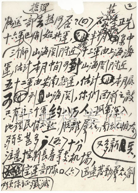 1945年1 1 月 1 0 日 为 中 共 中 央 起 草 致 东 北 局 电 : “ 迅 速 发 动 群 众 创 造 战 场 , 向 民 众 宣 传 蒋 介 石 收 复 东 北 无 功 、 抛 弃 东 北 有 罪 , 造 成 民 众 反 蒋 热 潮 ; 派 大 批 民 运 党 务 干 部 去 沈 阳 山 海 关线 、 沈 阳 营 口 安 东 线 , 把 发 动 民 众 创 造 战 场 当 作 当 前 紧 急 战 略 任 务 , 千 万 注 意 。 ”