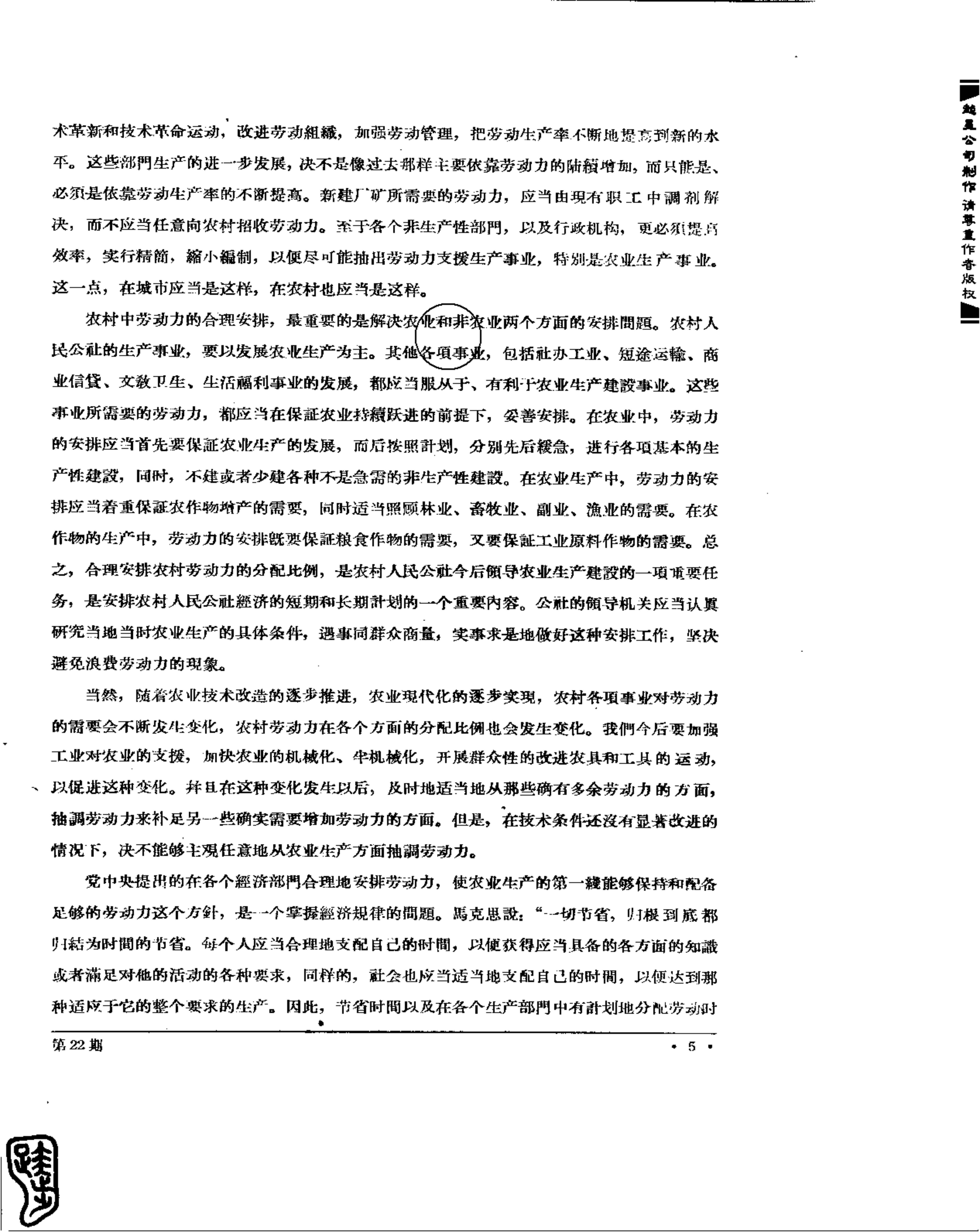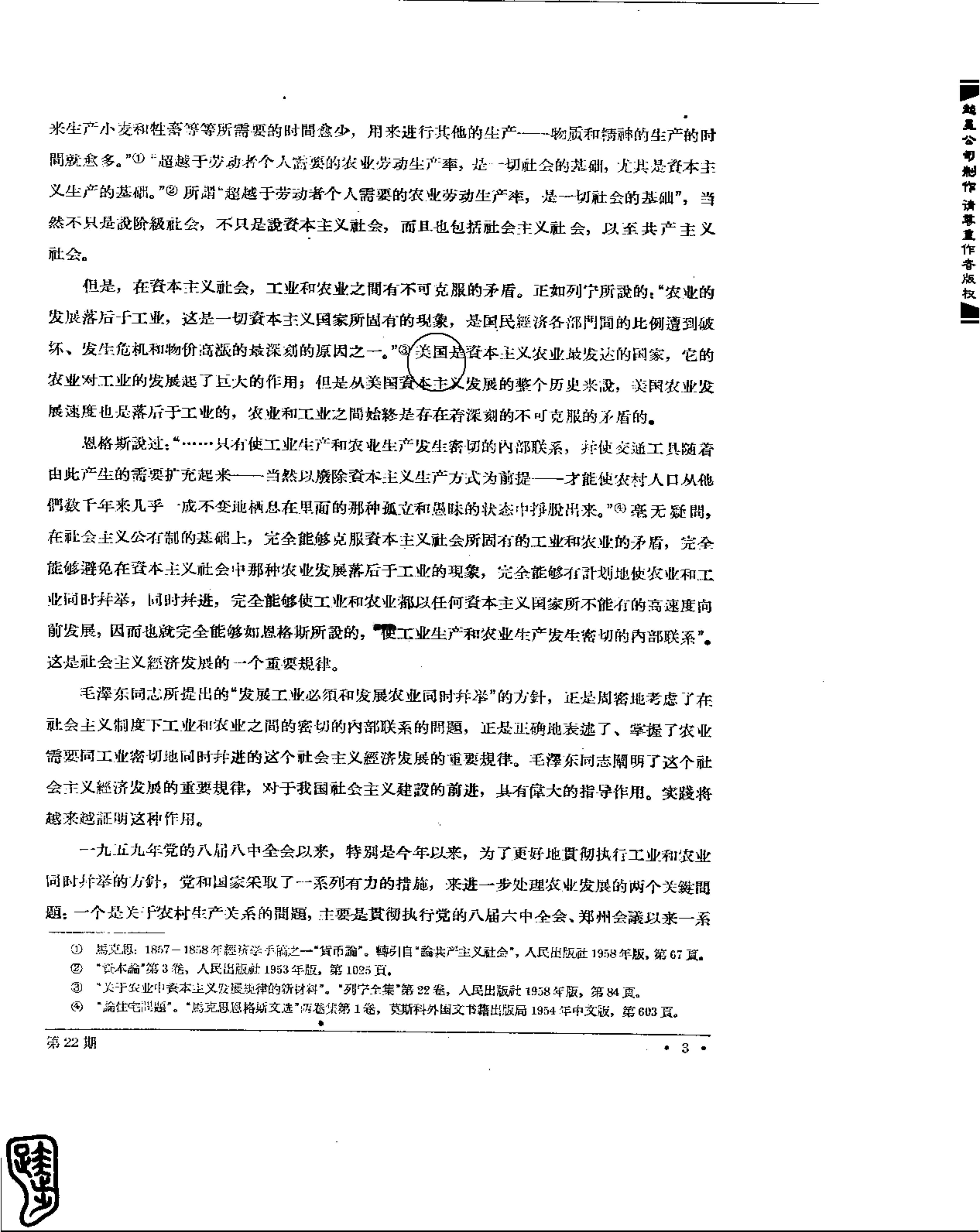 社论强调贯彻工农业并举的方针,要把农业放在首要地位。指出必须进一步处理好农业发展的两个关键问题:一个是关于农业生产力的问题,主要是使农业生产第一线保持足够的劳动力;一个是关于农村社会主义生产关系的问题,主要是坚持和巩固以生产队为基础的公社三级所有制。处理好这两个问题,就有可能在较燔时间内改变目前农业发展落后于工业发展的状况。