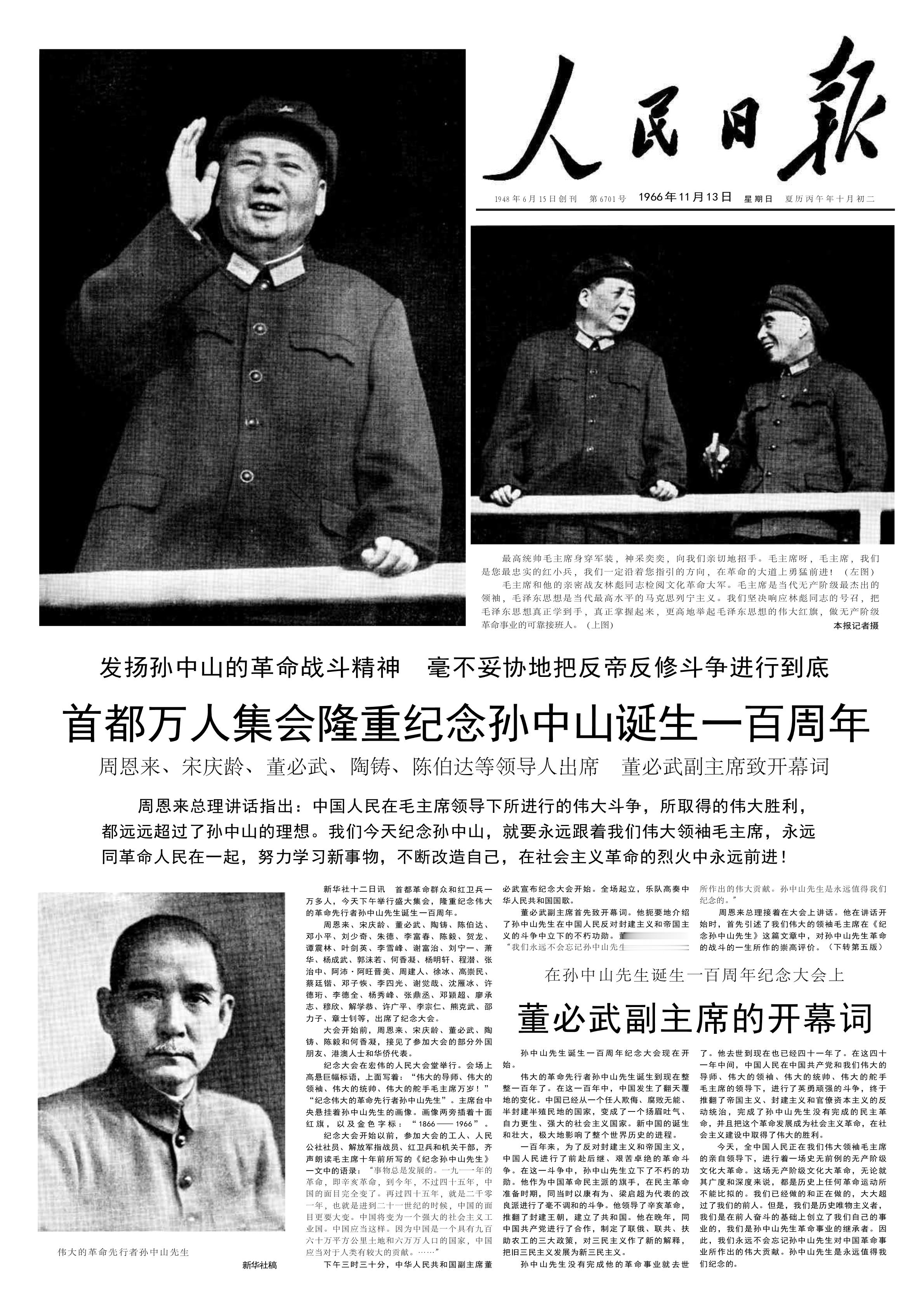 1966年11月12日下午,北京举行一万多人的盛大集会,隆重纪念孙中山诞生一百周年。周恩来在会上讲话。出席纪念大会的有:宋庆龄、 董必武、陶铸、陈伯达、邓小平、刘少奇、朱德、李富春、陈毅、贺 龙、谭震林、叶剑英、郭沫若、何香凝、杨明轩、程潜、张治中、 阿沛•阿旺晋美、周建人、蔡廷锴、李四光、沈雁冰、许德珩、李德全、邓颖超、廖承志、许广平、李宗仁、邵力子、章士钊等。