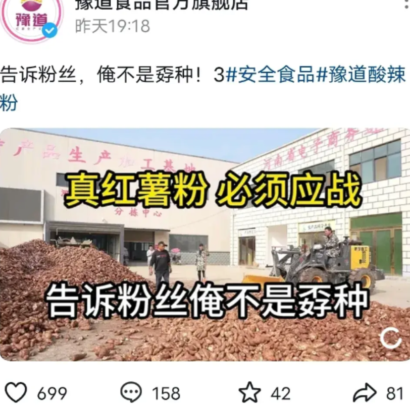 良品铺子被查后,终于有同行愿意出来说两句了! 本以为这件事所有人都会沉默到底,没想到还是有一些人敢于站出来证自己! 这绝对是好的风向,食品厂要是不能公开透明的展示自己食品的原料和制作过程,老百姓怎么能放心买你的东西? 有些商家他就不配去接住这波流量,这下陈薯和豫道的生意不说爆火,恐怕也要火热好一阵! 沉默什么也不会改变,咱们敢作敢当,自证清白,也不能辜负粉丝对品牌的信赖不是?