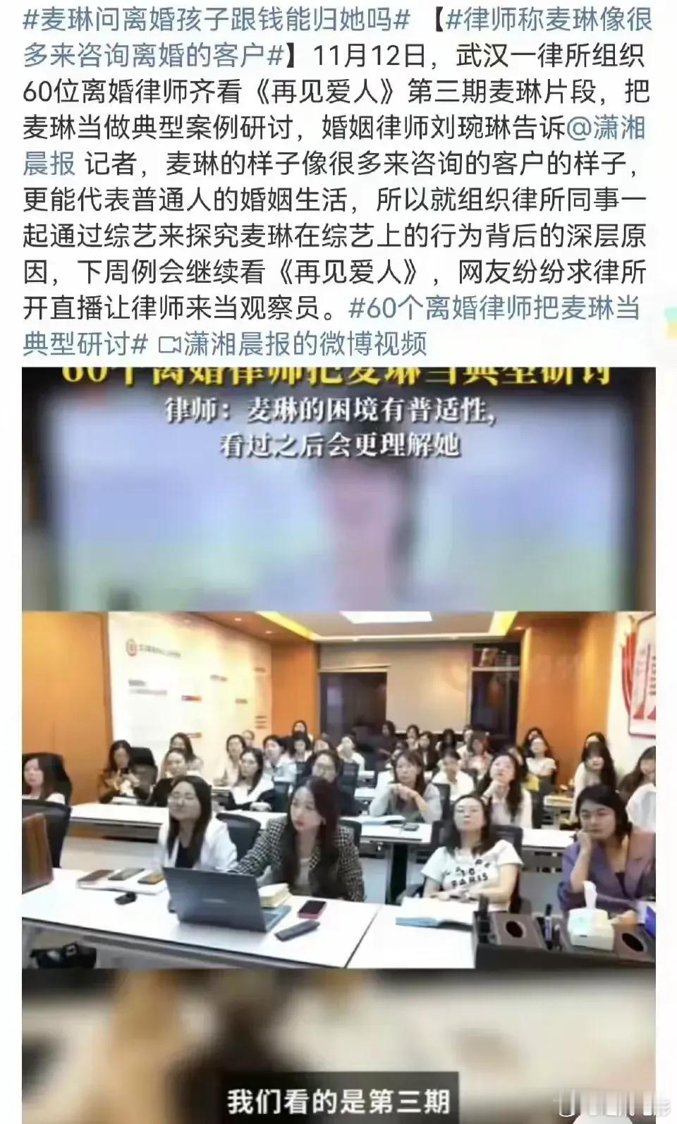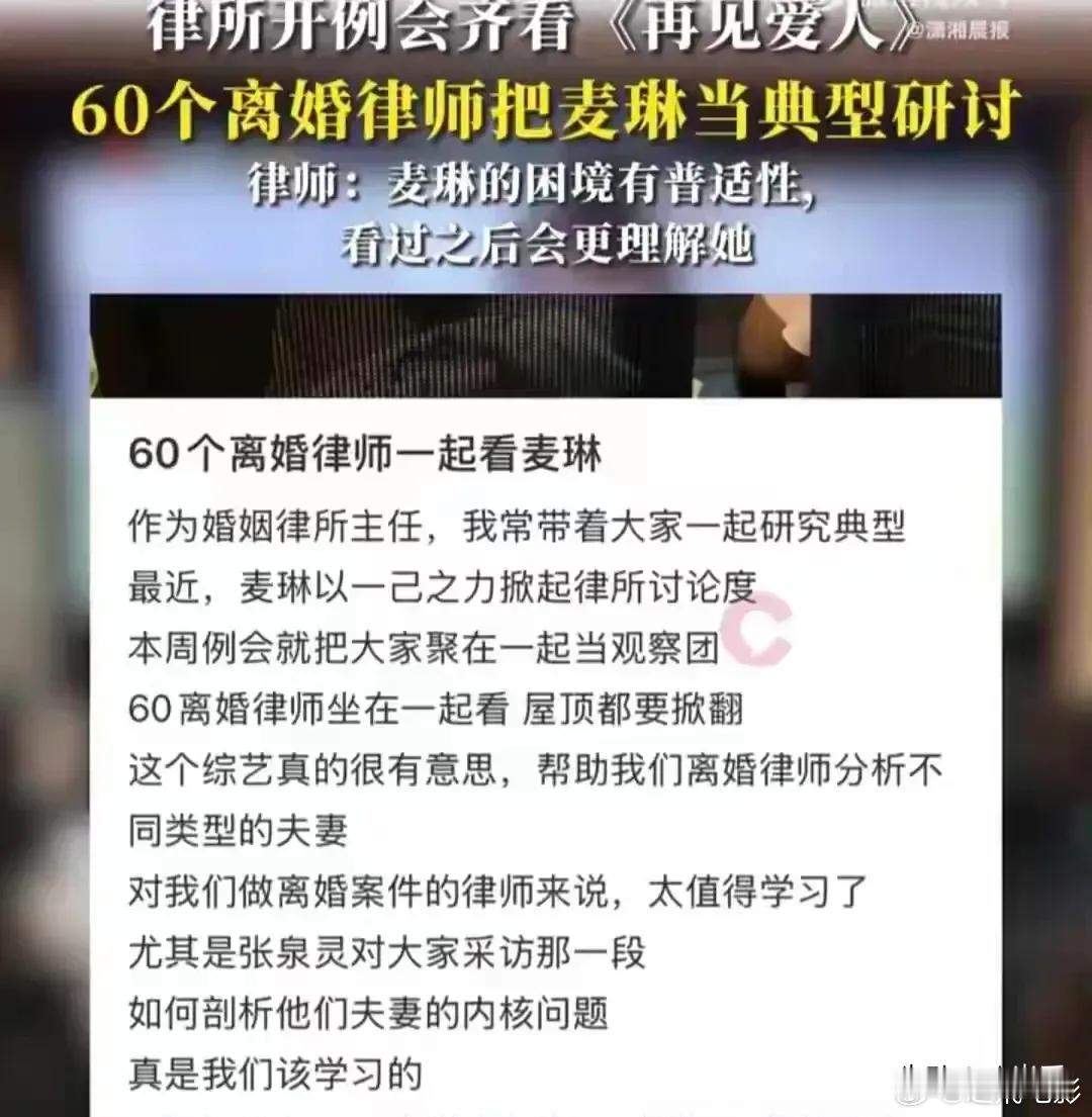 武汉一家律所组织60位离婚律师观看并研讨热门综艺《再见爱人4》中麦琳的片段,将麦琳作为典型案例。