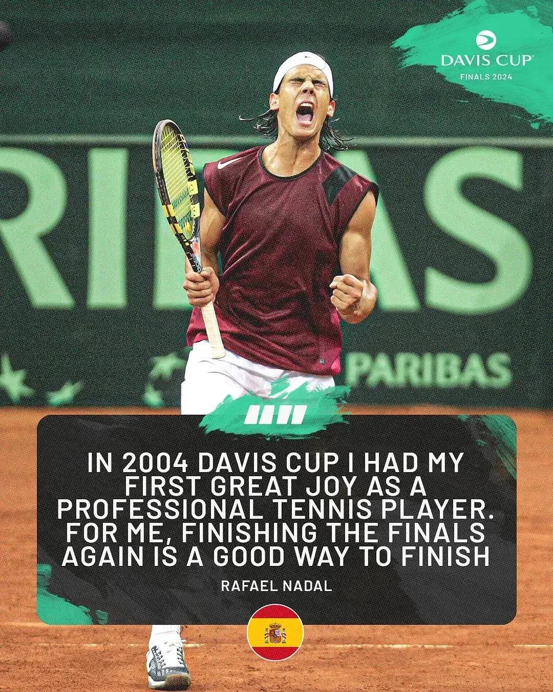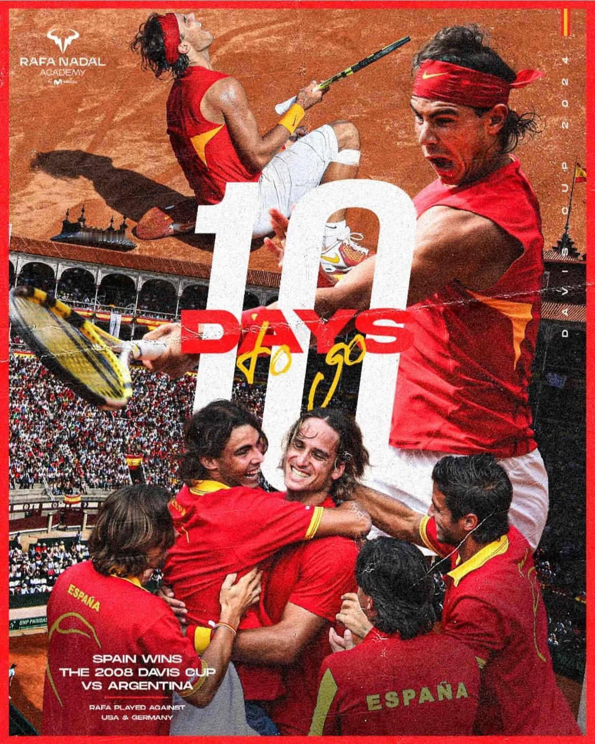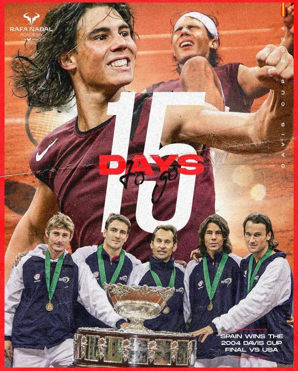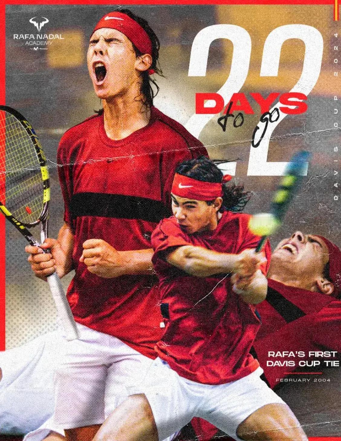 很喜欢几张拉法纳达尔学院为纳达尔做的退役倒计时并戴维斯杯海报。 海报背景融合着西班牙国旗的颜色,也对应着纳达尔出征戴维斯杯将穿上国旗颜色的球衣。每一张海报记录着西班牙队赢得戴维斯杯冠军的庆祝时刻。 海报有岁月的质感,就像是一张很喜欢的海报,贴在墙上,每天看着渐渐被时间沉淀的物件,记录着一段美好的故事。 戴维斯杯是纳达尔职业生涯荣耀加身的起点,对于他来说在戴维斯杯决赛中结束他的职业生涯是一个有始有终的呼应。 对于现役球员来说,也将是一个见证传奇球员退役的时刻,一个特别的赛事。