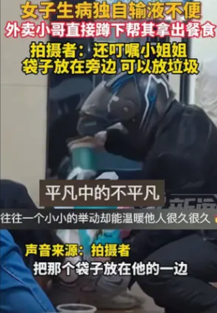 浙江,女子生病独自去医院输液,期间还点了一份外卖。外卖小哥送到后见女子一只手输着液,感觉吃饭会很不方便,便直接蹲下来将饭拿出来,把袋子放到一边好扔垃圾。不得不说这位外卖小哥实在太暖了。
