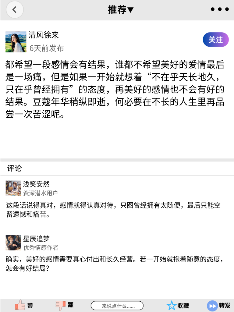 寻找爱情,就像种下一棵树,需要找到那片最适合它生长的土地。你若想要婚姻的美满,就不要和对婚姻无感的人恋爱;你想让爱情充满浪漫,就和有浪漫情怀的人携手;你追求稳定,就要遇到一个能够给你安全感的人。每个人的生命中只有一次青春,切莫让它在错误的选择中流逝。宁愿忘记一个你曾深爱过的人,也不愿记得一个你没办法爱的人。珍惜这一路的缘分,别让任何一段关系变成你青春里的一次苦涩回忆。毕竟,美好不是一开始就想着调味品的味道,而是在味道中慢慢品味人生的味道。