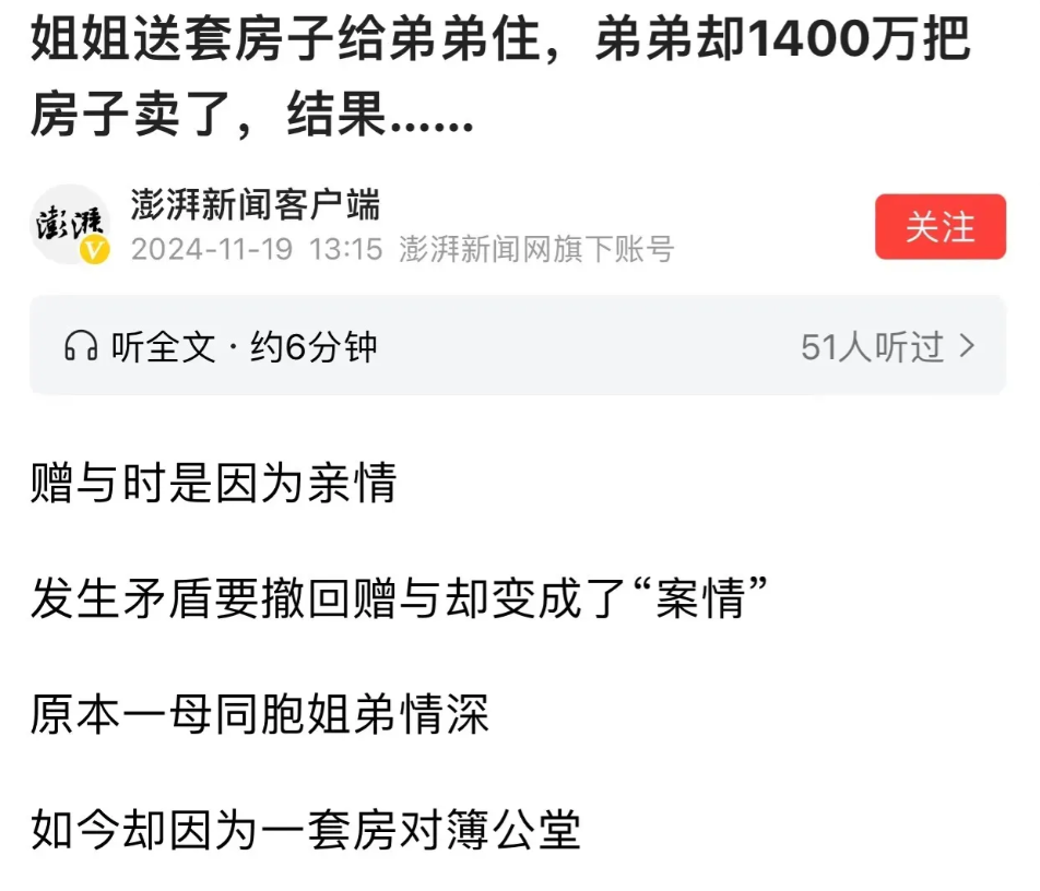 福建思明,姐姐送了一套房子给弟弟,可弟弟却1400万把房子卖了!姐姐知道后要撤销赠予,可弟弟却说:“送出去的东西泼出去的水,哪有往回收的道理?”但法院的判决却出人意料!