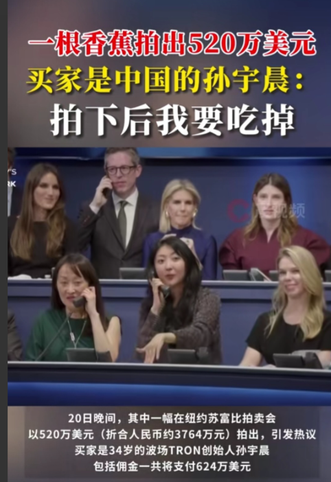 才34岁就能靠着自己的智慧赚钱入选福布斯,孙宇晨的财力不容小觑,成功拍下后,孙宇晨居然表示他打算吃掉那根香蕉。