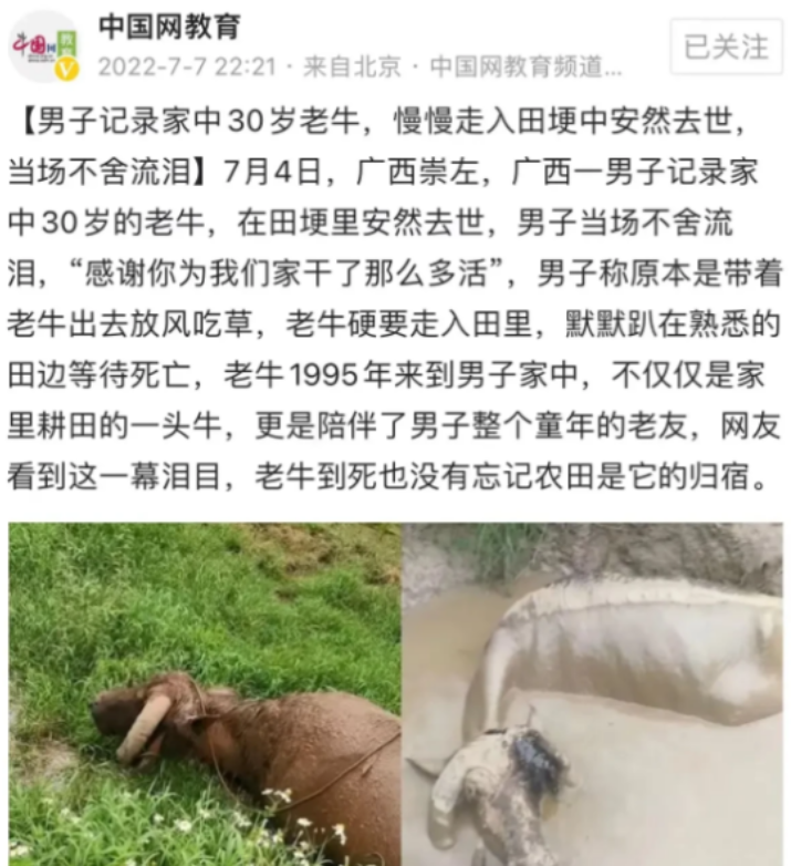 2022年,广西一男子牵着家里老牛外出吃草,可老牛突然不听使唤,硬是要往田里走,男子顺着老牛的路线走去,可接下来的一幕却让男子泪流不止…… 那天清晨,阳光透过薄雾洒在田野上,一片生机勃勃的景象。 男子牵着那头30岁的老牛,缓缓地走出家门,这头老牛早已不再是单纯的劳动力,它更像是一位家庭成员,陪伴着男子度过了无数个春秋。 老牛的眼神里,总是透露出一种深邃的智慧,仿佛它能听懂人们的话语,感受到人们的情感。 男子原本以为这又是一个寻常的放牛日子,却没想到老牛的举动异常。 它不再像往常那样悠闲地吃草,而是坚定地朝着田里走去,男子心中一紧,他知道这头老牛极具人性,它此刻的行为,必定有着特殊的意义。 跟随在老牛身后,男子看到了一幅幅熟悉的画面:田间的水渠、郁郁葱葱的庄稼、还有那些曾经一起劳作的村民。 老牛似乎在回忆过去,它的眼神中流露出一种淡淡的忧伤,男子突然意识到,这片土地见证了老牛的一生,它在这里耕耘、成长,这里有着它最美好的回忆。 终于老牛来到了一片它尤为熟悉的田地,这里的每一寸土地,都留下了它辛勤的足迹。 老牛缓缓地趴在田边,眼神中透露出一种释然,男子站在一旁,紧紧地握住牛绳,泪水在眼眶中打转。 他明白老牛已经做出了选择,它要在这片土地上,结束自己的一生。 就在那一刻,周围的动物仿佛也感受到了老牛的气息,一只忠实的狗跑了过来,静静地蹲在老牛身边,仿佛在为它送行。 树上的鸟儿停止了歌唱,田野中的昆虫也安静下来,整个世界仿佛都在为这位忠诚的劳动者默哀。 男子含泪看着老牛,回忆起它陪伴自己度过的时光,这头老牛不仅教会了他勤劳和坚韧,更让他明白了什么是忠诚和奉献。 它用自己的行动,诠释了动物与人之间那份深厚的情感,男子知道老牛的离去,将是他心中永远的痛。 在老牛逝去的那一刻,男子感到一种前所未有的空虚,他轻轻地为老牛合上眼睛,默默地祈祷它在另一个世界能够安息。 随后他挖了一个小坑,将老牛安葬在它钟爱的土地上,周围摆满了青草,寄托着男子对老牛无尽的思念。 这个故事在村里传为佳话,人们纷纷感叹动物的人性。 是啊许多动物都有着超乎我们想象的感知能力,它们懂得感恩、忠诚和牺牲,这头老牛用它的生命,向世人展示了动物与人类之间那份深厚的情感纽带。 在这个世界上,动物们用它们的方式,陪伴着我们,给我们带来欢乐和感动。 它们不仅是我们的伙伴,更是我们生命中不可或缺的一部分。 让我们珍惜与它们相处的每一刻,用心去感受那份来自动物的人性光辉,而这头老牛,将永远活在男子和村民的心中,成为永恒的回忆。 (参考资料:都市街道办—2022-07-08—广西:30岁的老牛坚持走到田里,临走前的一个举动让主人泣不成声)