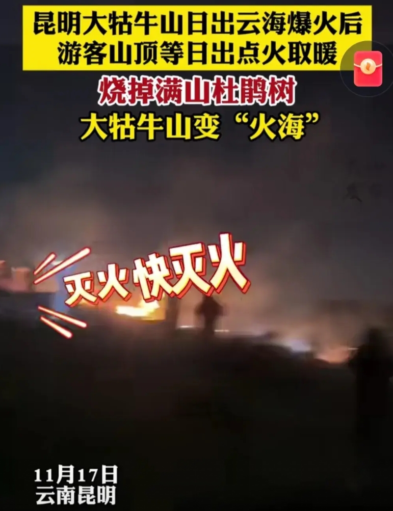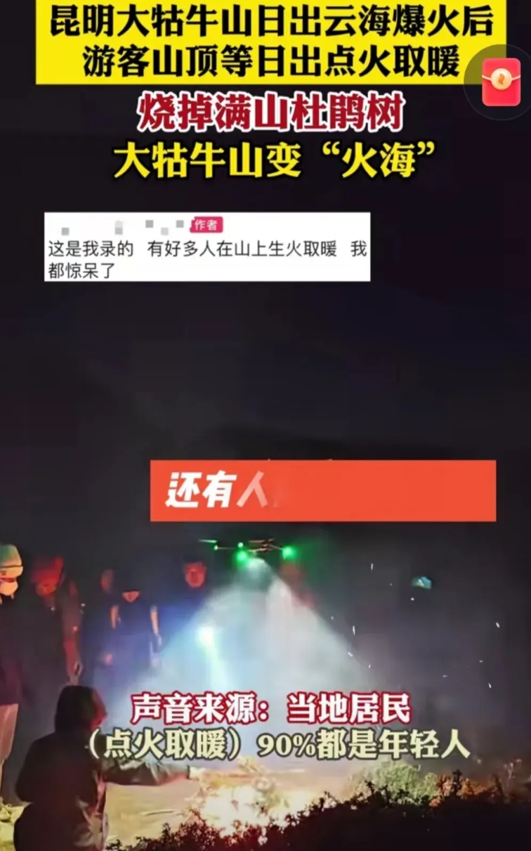 近日,云南昆明东川大牯牛山真火了!放火烧山的年轻男女不光任性,还特嘴硬!云南昆明大牯牛山,海拔四千米。男女大学生为了看日出,半夜爬到山顶。在山顶烤火取暖,把国家二级保护植物矮脚高山野杜鹃当柴火烧了。用无人机酷炫扇风,围着火堆吹呼跳跃,纷纷发小视频朋友圈炫耀。