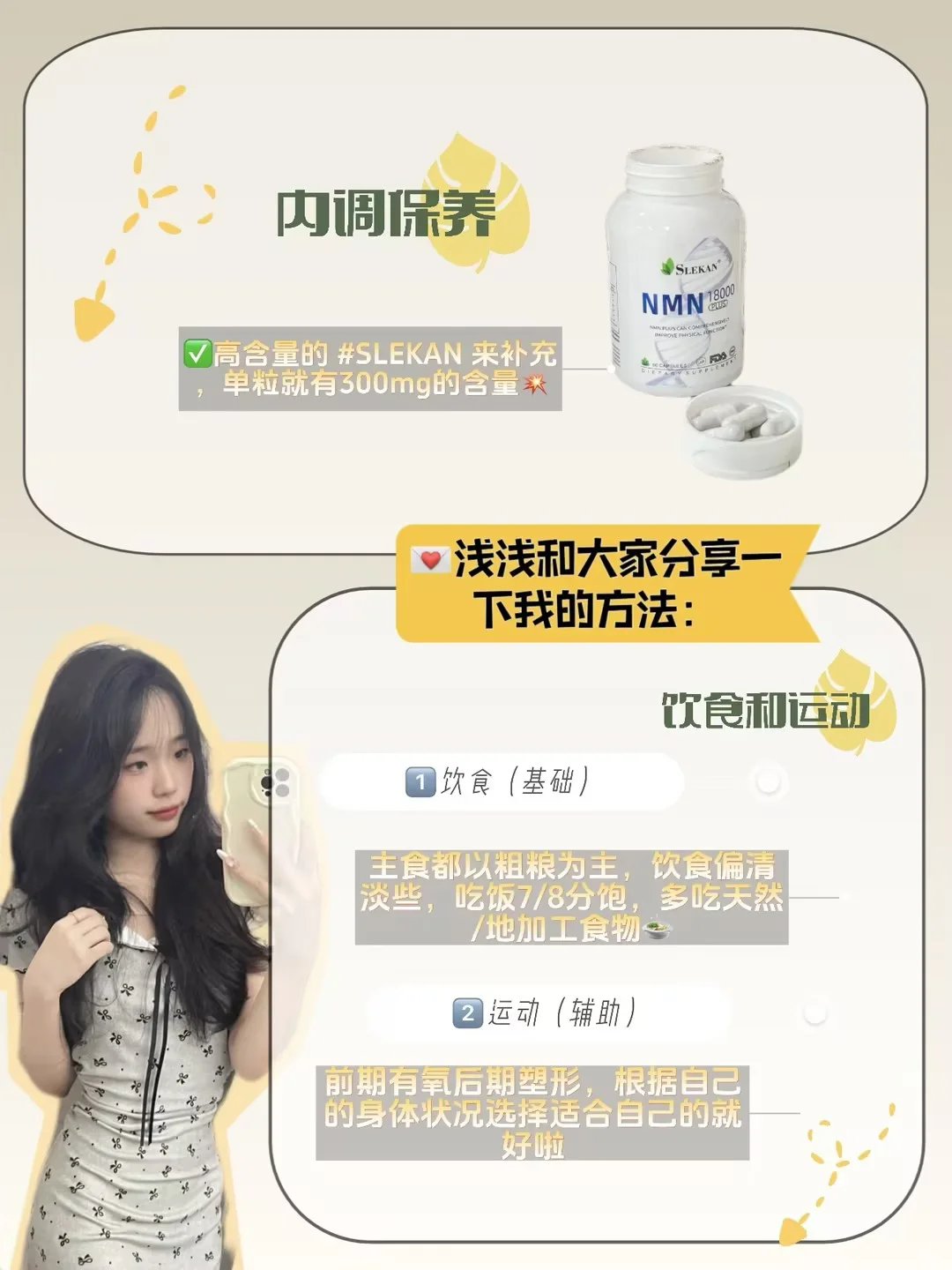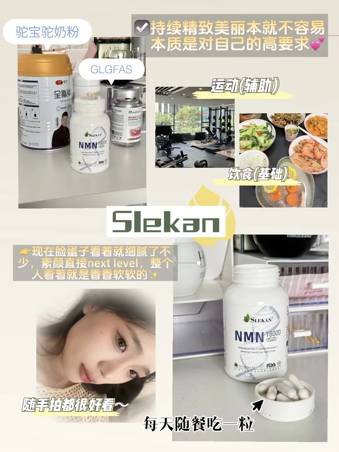 真的吃到了颜值红利💥!比起之前更多了一种随性的美丽,这是一份自然松弛的状态~ ✨脸蛋也是嫩嫩嘟的怎么拍都好看🙈,干净透亮的皮肤底子直接把氛围感一整个拿捏住了! - 💖当然不是没技巧纯美啊,虽然五官是天生,但后天保养也是缺一不可,变美的底层逻辑就是重新养自己的决心💪和行动,内调外养同步进行才能发挥出1+1>2的效果~ - 💌浅浅和大家分享一下我的方法:内调+饮食+运动 ————内调保养———— 我属于夜猫子🐱加甜品脑袋,要想让皮肤看起来紧致充盈、透亮干净,光靠外用护肤是远远不够的,从内去改善也很关键👏🏻! ✅重重筛选之下才入手高含量的 SLEKAN 来补充,单粒就有300mg的烟酰胺单核苷酸含量💥,还有白藜芦醇、谷胱甘肽等成分加持,buff叠加皮肤要想不好都很难👏🏻~ 👉吃着变化还能够显而易见的,现在脸蛋子看着就细腻了不少还滑溜溜💡的,素颜直接next level,整个人看着就是香香软软的✨ - ————饮食和运动———— 1⃣饮食(基础) 我现在三餐也不会刻意控制,但是主食都以粗粮为主,饮食偏清淡些,早起一杯0蔗糖的驼宝驼奶✌🏻。 吃饭7/8分饱,多吃天然/地加工食物🍲,少吃高糖重油重盐的食物~ 2⃣运动(辅助) 平时运动也是没在偷懒的😄,前期有氧后期塑形,根据自己的身体状况选择适合自己的就好啦。🏋‍♀运动前,我还会吃glgfas来配合运动,直接就是1+1>2的效果。 —— ☑最后想说:持续精致美丽本就不容易,本质是对自己的高要求💕,不要急于求成,享受自己慢慢变好的过程~ ——