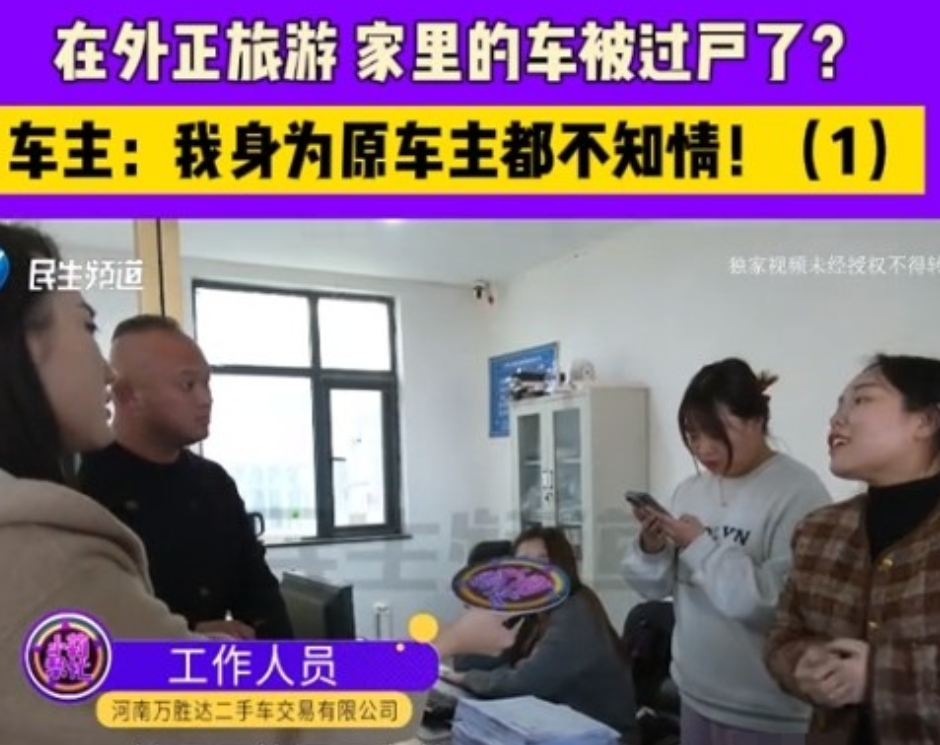河南三门峡,女子在旅游期间,自己的坦克300被“朋友”开走,本以为大家都是朋友,就没有过多询问,可旅游回来后,竟发现自己的车子被过户至了二手车公司!等女子发现后,立马前往二手车公司,这时女子才发现复印件性别为男,气得女子当场发飙,怒斥工作人员审核不严! 10月24日,秦女士和丈夫结束了店里的事务,满怀期待地踏上了前往拉萨的旅途,可他们未曾想到,一场意外正悄然酝酿。 旅行期间,秦女士名下的坦克300却被一位“朋友”擅自开走,秦女士夫妇最初通过手机监控偶然发现了这件事,但出于对朋友的信任,他们并未责怪对方,甚至还认为这位朋友可能有急事。 可事态的发展远超他们的想象,多日过去,这位朋友始终未联系他们,电话也始终无法接通。 因为一次随意的查找,秦女士的丈夫发现,在交管系统中竟然查询不到自己车辆的信息,无论如何输入车牌号,系统中都无法查到任何相关记录。 费了九牛二虎之力,秦女士夫妇才得知,自己的车辆已经人被过户了,户主正是一家二手车公司,更让人费解的是,过户手续竟然没有车主本人参与,也没有提供车辆原件或委托书。 抱着最后的一点希望,秦女士夫妇来到了车管局,可车管局的回复却让他们寒透了心,“只要证件准备充分,当事人不需要当场也可以成功办理!” 为了查明真相,秦女士夫妇随即来到二手车公司,希望能获取详细信息,工作人员提供的过户资料让两人大吃一惊——过户人信息竟显示是一位姓秦的男性,而秦女士分明是女性! 看到这一漏洞,夫妻俩忍不住质问:“这是明显的错误,连性别都看不出来吗?” 面对质疑,二手车公司工作人员却显得毫不在意,只表示他们只是负责手续办理,更让人意外的是,过户材料中竟出现了“委托书”,上面还附有秦女士的签名和指纹。 她深知自己不可能签署什么文件,而事情的关键,就在于找到那位所谓的“朋友”,只有揪出真凶,才能还原事情真相。 目前,警方和媒体已介入调查,事件尚在处理中,秦女士虽然对追回爱车抱有希望,但车牌号中那珍贵的“3个8”恐怕难以挽回……