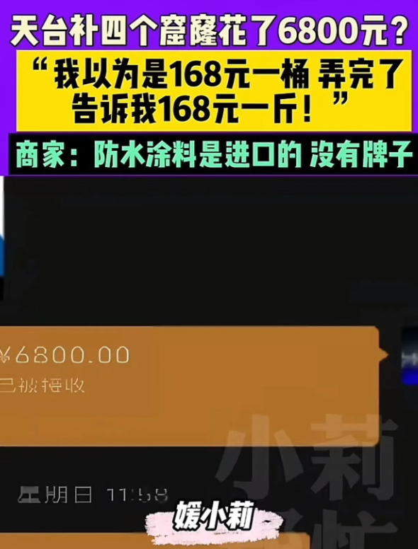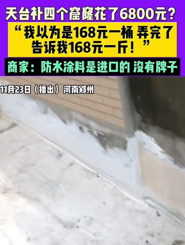 近日,河南郑州一男子找防水师傅补天台,四个窟窿被收了 6800元!男子:“我以为是 168 元一桶,弄完了告诉我是 168 元一斤!”业内人士:“撑死 1000 块钱,胶水成本不超过 200 块钱!”网友:徽注胶帮,我上过当!