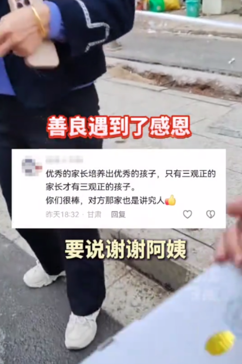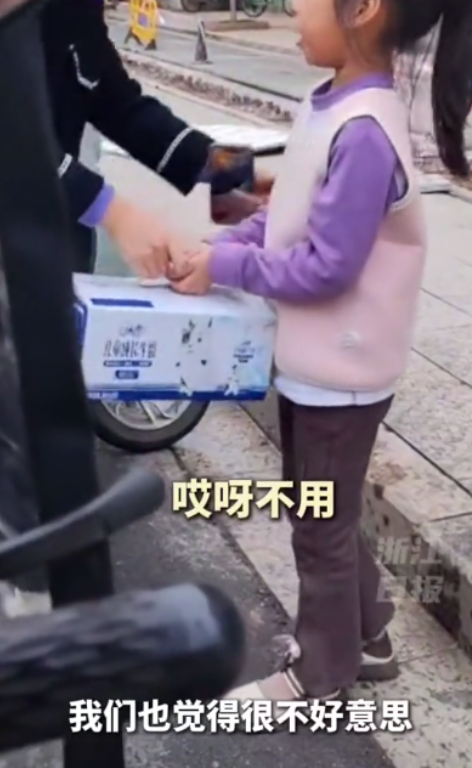 只见一位女士骑着电动车来到了她们的面前,在女儿将手中捡到的电话手表交还给对方妈妈后,对方妈妈竟然提着一箱牛奶递给了女儿,谢女士顿时觉得很不好意思,一点小事就不用这么客气的了,但是对方妈妈却十分直接的将牛奶放到了女儿的手中,最后,谢女士也只好收下这代表着女儿做好事的象征。