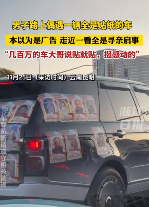 泪目!男子开车在路上偶遇一辆全是贴纸的汽车,本以为是广告,不料走近一看竟然全是寻亲启事,男子不禁感叹:几百万的车大哥说贴就贴,挺感动的!网友:最好看的车贴没有之一!
