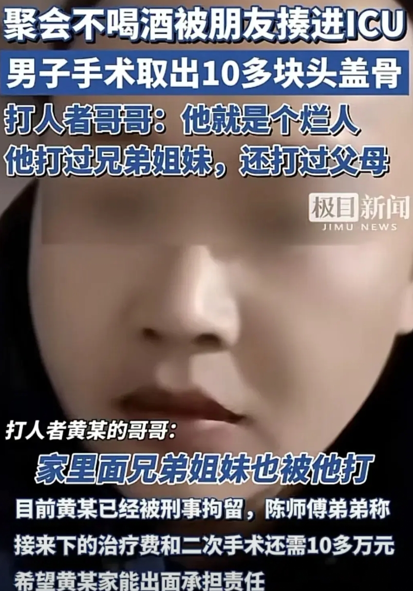 贵州毕节,男子和朋友聚会,闷头吃饭,朋友问他会不会喝酒,男子不会喝酒,只好摇摇头,却不料,朋友就挥拳头过来,猛打他一顿,导致他的头盖骨碎了十几块,接下来的费用至少也要十几万,但朋友不愿意赔钱。朋友的哥哥还气愤地说:这个烂人,家里的兄弟姐妹他都打,连父母都打。