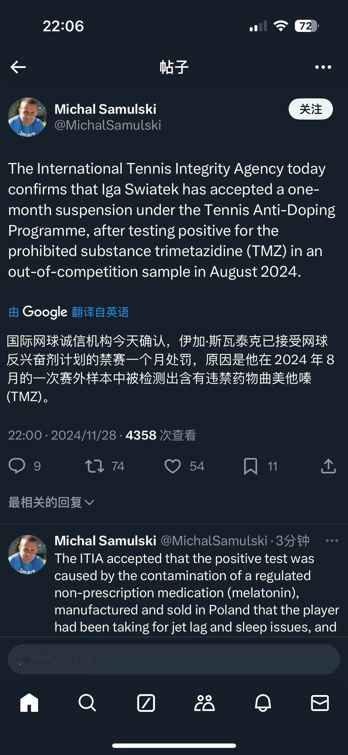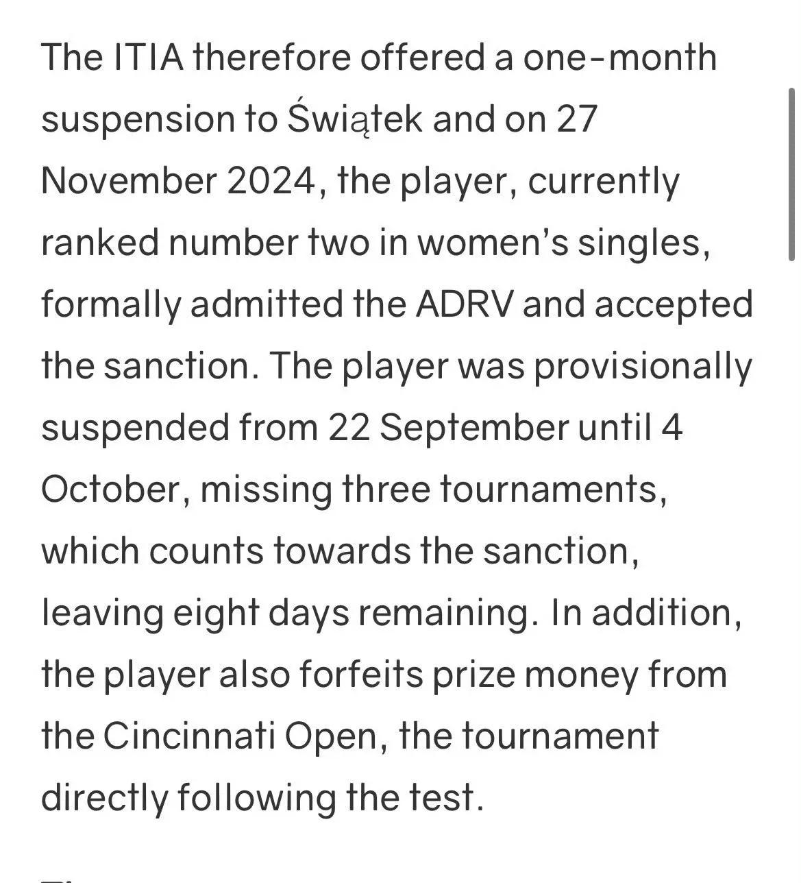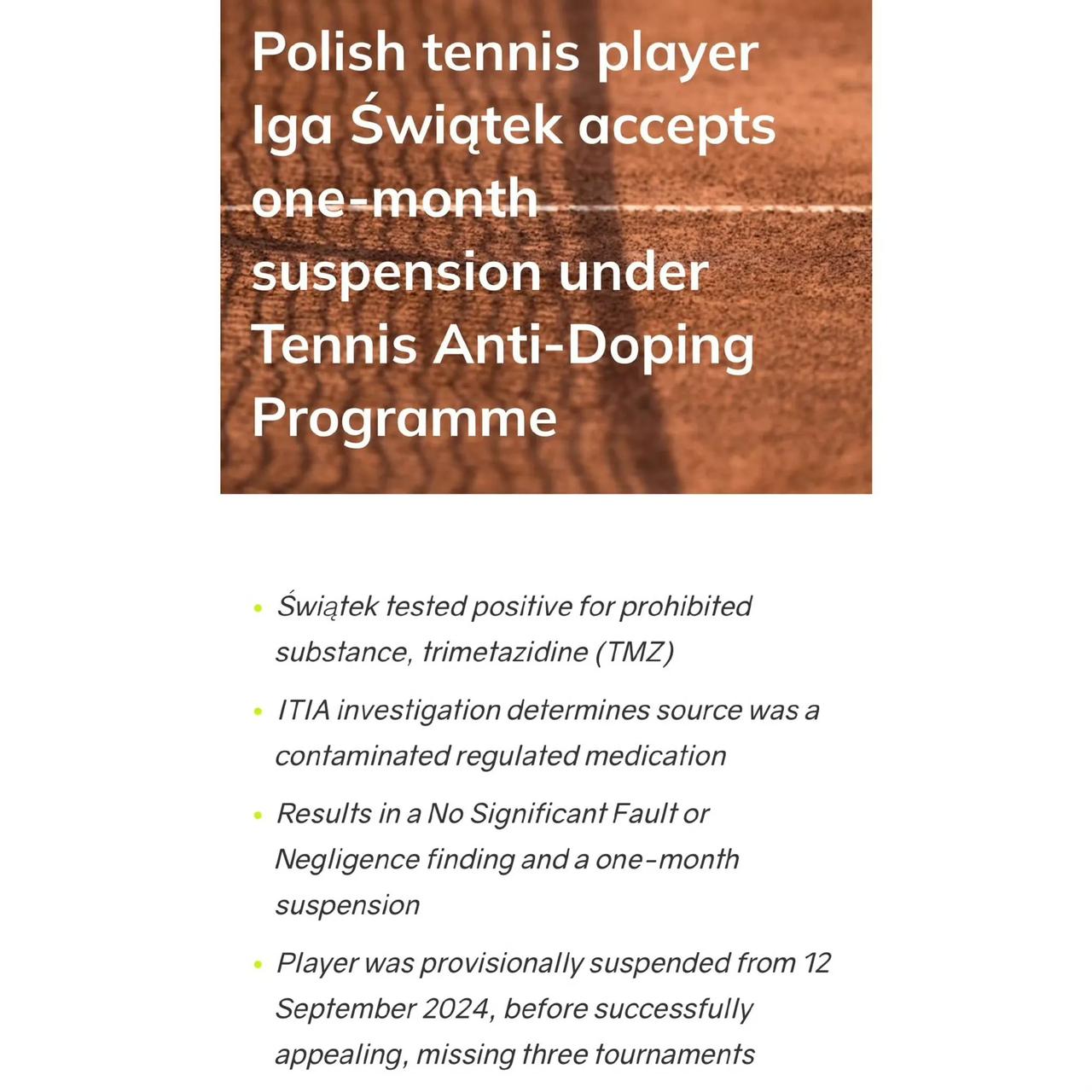 又一个重磅新闻,网球诚信机构今天确认,伊加斯瓦泰克已接受网球反兴奋剂计划的禁赛一个月处罚,原因是她在 2024年8月的一次赛外样本中被检测出含有违禁药物曲美他嗪(TMZ)。 为此她错过了中国赛季,失去辛辛那提公开赛的奖金,并且自此以后背上“药家宜”的名声。以她的实力和地位来说,代价有点大。