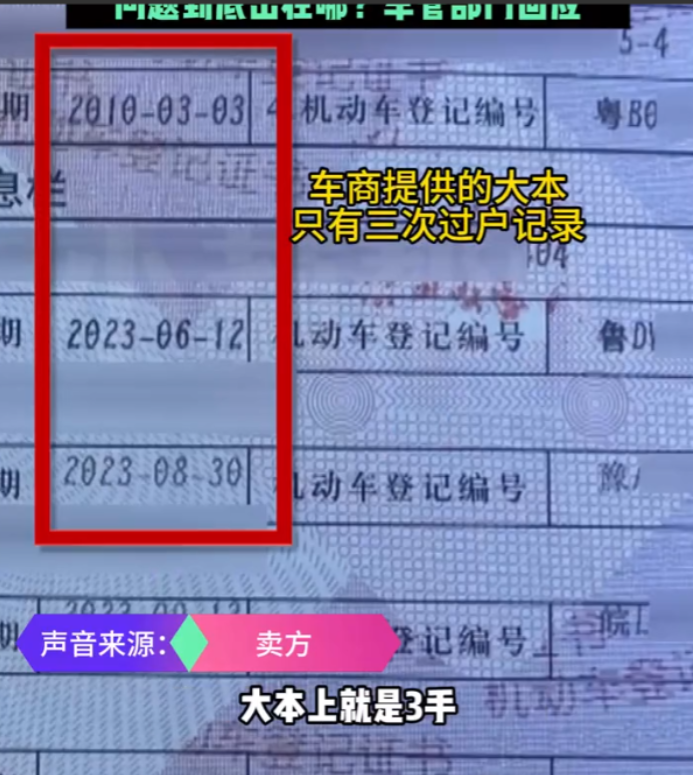 草率了!最近,安徽一名男子想买车,于是就到二手车市场淘了辆豪车,花了470000元左右,车商告诉他这车还比较新,只过户了3次。男子当时还以为捡到便宜了,因为原价要几百万呢,现在几十万拿下了,非常划算。 好巧不巧,后来,这车的机动车证书弄丢了,男子去补办了证书。结果显示,这车居然被业务登记了23次,转让登记了14次。也就是说,在他之前已经转让了13次。 说实话,转让3次和13次的区别还是挺大的。 首先,车辆磨损情况不同。 转让3次,车辆的故障频率、事故频率、行驶里程等相对有限,磨损程度较低,车况更稳定。转让13次,出现故障或者的事故的频次可能多,车身性能难以保证。 其次,市场价值不同。 转让3次,折旧较少,毕竟维保记录比较清楚,磨损程度也好鉴定,折旧的时候价值也要高一些。转让13次,光听次数都可以吓退买家了,根本没得什么价格可谈,以后如果想再次出手,恐怕得骨折价,这跟变相贬值没区别。 再者,后期维修成本不一样。 转让3次维修相对简单一点,是否经历过重大事故、水泡等特殊情况,追溯起来会更容易一些,但转让13次,这些潜在的风险恐怕不好查,到时候出了问题,维修成本可能很高。 有网友表示:都买二手了,还管他是3手还是300手,最重要的是车况,车有没有什么问题才是重点! 说实话,普通人难就难在判断车况上,就算现在使用是正常的,也不敢保证他的车况好,毕竟过户次数多了,可能存在潜在隐患。再加上二手车市场本来就缺乏诚信,这一般人还真赌不起。 那么,车商是否刻意隐瞒了事实呢? 车商表示:“大本上就是3手,我们收回来的时候就是这样的,我们又没做错什么,承担什么责任?” 这事就难办了,无法确定车商是不是故意的,有可能前一手的车主都不知道真相。 主要是因为那个大本上只写了3次记录,没有标注历史次数等信息。按照惯例讲,大本有几页纸,记录多了可能会压缩,但也要标注历史过户次数。男子得啥都没有标,车管所工作人员表示:如果真是我们的错误不会推卸,会给上级汇报,该弥补就弥补。 之前转让过13次没跑了,只是看到底是谁的问题导致的,才好划分责任。不过,有一说一,车商不是都很懂行吗?怎么收车也只看一个本,没做其他技术鉴定?