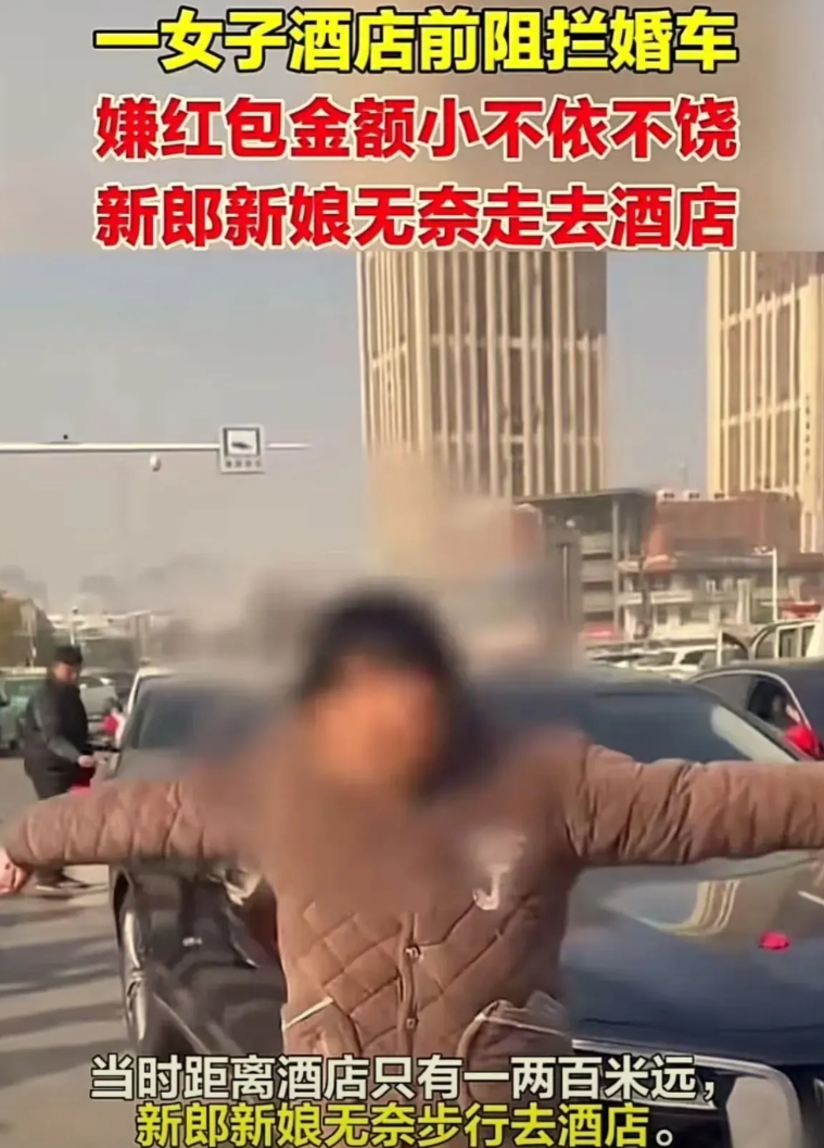 2024年,安徽阜阳,大妈拦下婚车讨要红包,新郎给了一包香烟和一个红包,但大妈嫌弃金额太小,竟然扬言:“不给 2 个红包不许走!”然后便挡在了婚车前面…… (参考资料:农林卫视) 这一天,原本是新郎新娘大婚的日子,新郎高高兴兴地去接新娘参加婚礼,没想到当婚车快到婚礼大厅时,竟然半路杀出个程咬金,拦住了他们的去路。 “不准走,发红包!”一大妈站在婚车前面,手舞足蹈地示意着新郎发红包。 说起来,这也是农村结婚时的一种习俗,尤其是在北方,当迎亲车队走在乡村小道上时,会突然冒出一群小孩或年轻人拦住婚车的去路,然后向新郎新娘讨要红包。 而新郎一般也会通过窗户递出红包,通过发放红包,以喜庆的方式将不好的东西 “买通” 或者 “驱散”,让新人能够顺利成婚。 红包的金额不会要求太高,通常是一些寓意吉祥的数字,如 5 元、10 元,象征着 “五谷丰登”“十全十美” 之类的美好祝福。 在得到红包后,拦路的人一般会说一些祝福新人的话,通过这个简单的互动游戏,使得迎亲过程变得更加有趣。 不过像大妈这个年纪的人还出来要红包,着实不多见。 尽管如此,为了结婚的喜庆,新郎还是将一个红包和一盒烟递给了大妈。 谁料大妈在看到红包金额后,并没有接受红包,而是郑重地说道:“红包太小了,我不要,我也不抽烟,这烟我不要,你必须给我包一个大的红包。” “这红包你就拿下吧,赶紧让路了,婚礼马上开始了。”新郎礼貌地说道。 不曾想,大妈根本不听劝,反而非常蛮横地站在车前,挡住婚车不让走。 一时间,迎亲队伍的亲朋好友纷纷下车,看着眼前的这一幕。 一位男子走到大妈身边指责道:“你这人怎么这样呀,给你红包已经够意思了,你还想怎样?” 这位大妈也是个蛮横无理的主,你跟她讲道理,她直接和你耍流氓,只见她张开双臂挡在车头前叫嚣道:“不给红包就不让走,有本事你们开车呀,来,撞我,撞我……” 看大妈如此作态,众人感到很是无奈,不是说大红包给不起,可新郎新娘和大妈非亲非故,凭什么给你红包呀。 再者说,谁的钱也不是大风刮来的,人家结婚,彩礼不要钱吗?请亲朋好友吃饭不要钱吗? 可大妈却不管这些,她是吃了秤砣铁了心,要和迎亲队伍斗到底,要么就给自己红包,要么婚车就从自己身上压过去。 眼看婚礼马上就要开始了,新娘和周围的亲朋好友都急得犹如热锅上的蚂蚁团团转。 正在大家考虑该怎么解决时,新娘一气之下突然走下婚车,直接朝着婚礼大厅走去,而众人见状,也尾随在新郎新娘后边。 大妈呆呆地看着这一幕,所有人都步行离开了,唯独把她晾在了原地。真是便宜没占着,却惹了一身骚。 有网友说,就应该报警,将她拘留几日。 也有网友说,丢脸不可怕,可怕的是根本不知道自己正在丢脸。 笔者想说,大妈一把年纪,不知自重,公然在大庭广众之下耍赖撒泼,为了那点红包金额,不惜破坏新人的大好日子,全然不顾及他人的焦急与感受。这种为老不尊的行为,只会让自己成为别人的笑柄。 大妈应该庆幸,遇到了脾气比较好的新郎和新娘,如果遇到脾气不好的,后果可能就难料了。