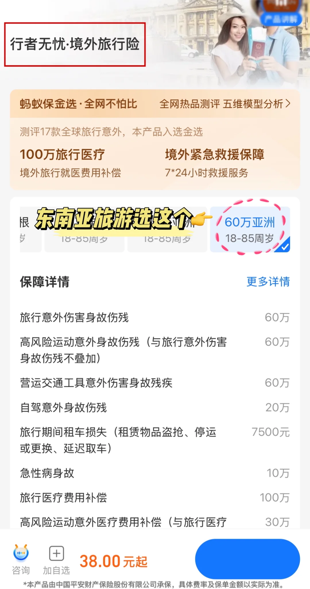 回国后跟闺蜜吐槽,才知道她出国前都会买境外旅行险,我那种情况就能保,就是这个「行者无忧·境外旅行险」像是旅程延误、行李随身物品丢失等都能保!