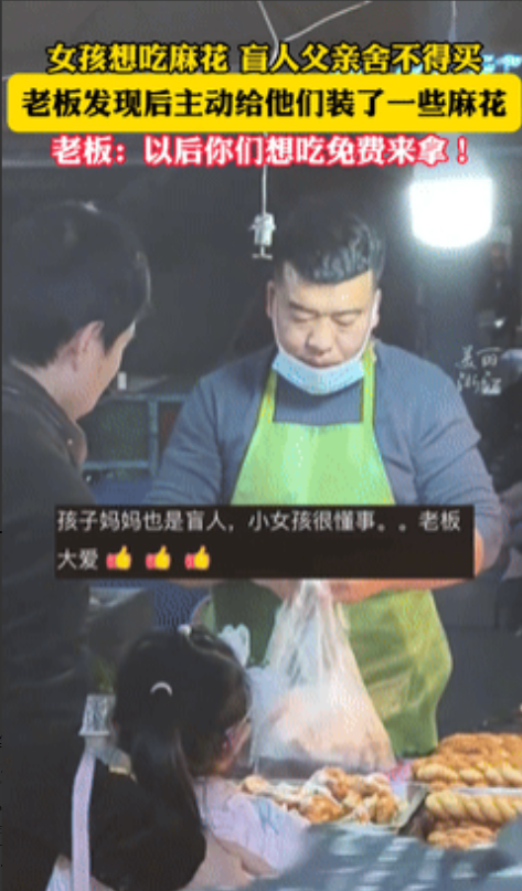 这个老板娘不发财都难!小女孩想吃麻花,盲人爸爸却舍不得买!老板发现后,主动送他们
