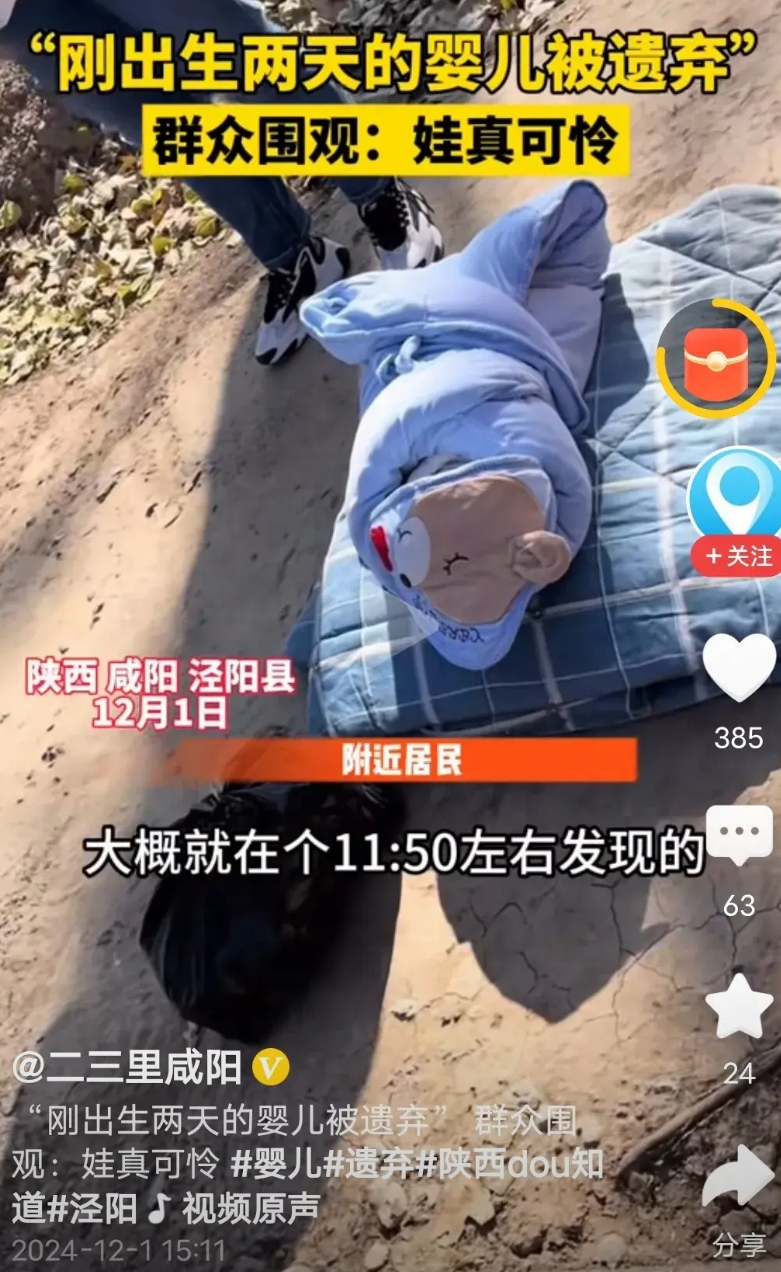 太可怜了,现在这个年代还有丢小孩的, 12月1日,中午12点左右,陕西咸阳,有居民在路边发现一个被遗弃的婴儿,婴儿看似刚出生两天,包裹的非常的好,干净,暖和! 婴儿已被送往医院了! 不知为什么这么好的婴儿被遗弃,未婚生子?还是有难言的苦衷? 再难也不能丢弃孩子!这个母亲有良心,包裹好再丢的,不似有些人直接光溜溜的丢掉!