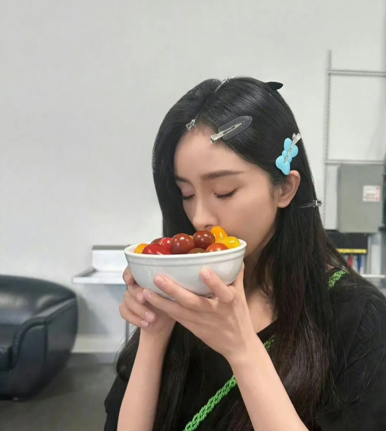 杨幂捧着一碗圣女果,一副陶醉的表情不知道想表达啥。