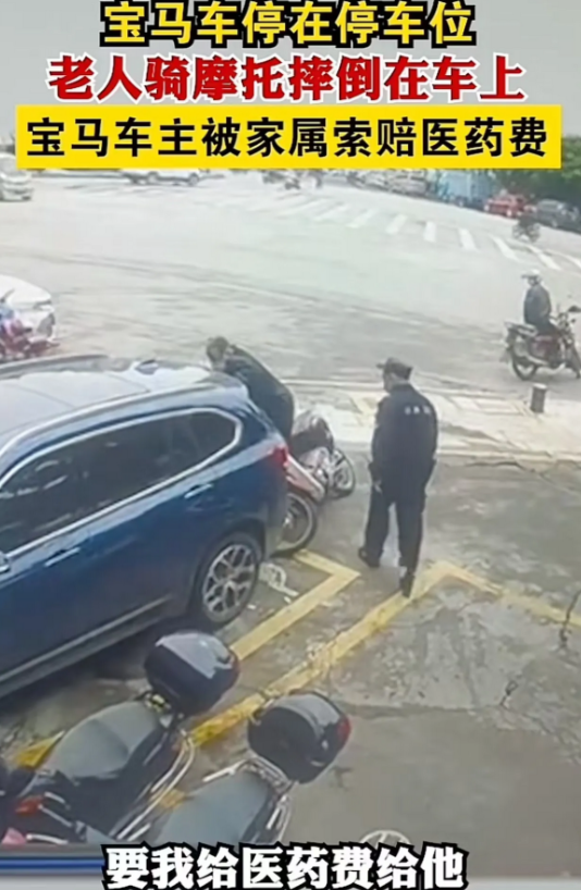 倒反天罡!2022年4月一女子把宝马车停在银行门口,大爷骑电动车不小心撞上,而大爷家属反过来向女子索赔!女子惊呼:“我车停在车位内没有动啊,不是应该你们赔我吗?”可没想到大爷家属理直气壮地说:“你都开上宝马了,何必跟我们斤斤计较呢?”