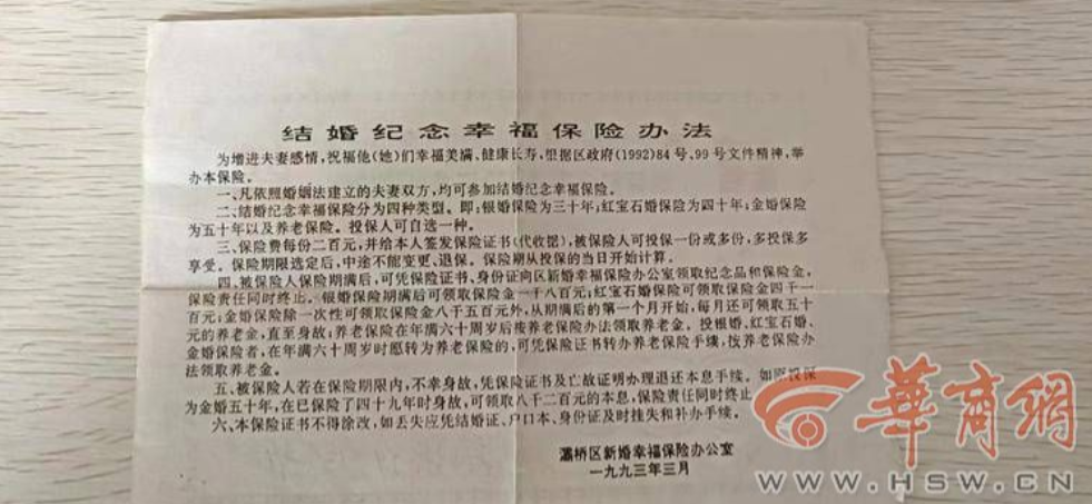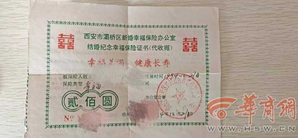 王先生和妻子是1994年12月在灞桥区新筑乡政府婚姻登记处喜结连理的。当时,除了领到大红的结婚证,登记处推荐小两口买一份"新婚礼物"——"结婚纪念幸福保险证书"。