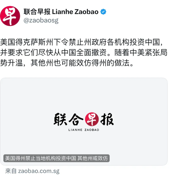 联合早报今天报道:“美国得克萨斯州下令禁止州政府各机构投资中国,并要求它们尽快从中国全面撤资。随着中美紧张局势升温,其他州也可能效仿得州的做法。”