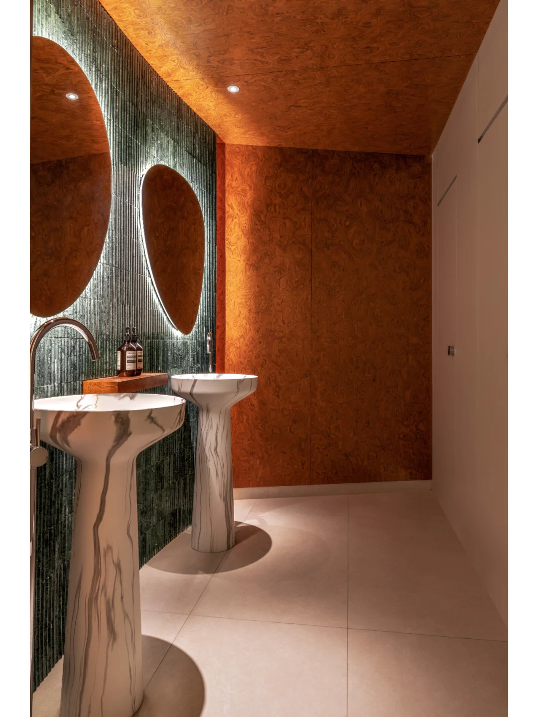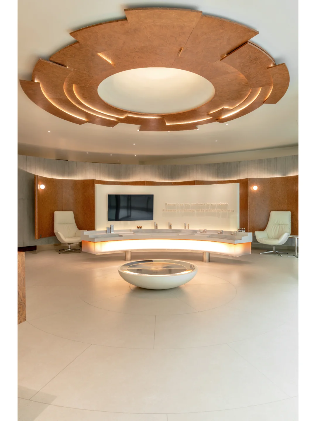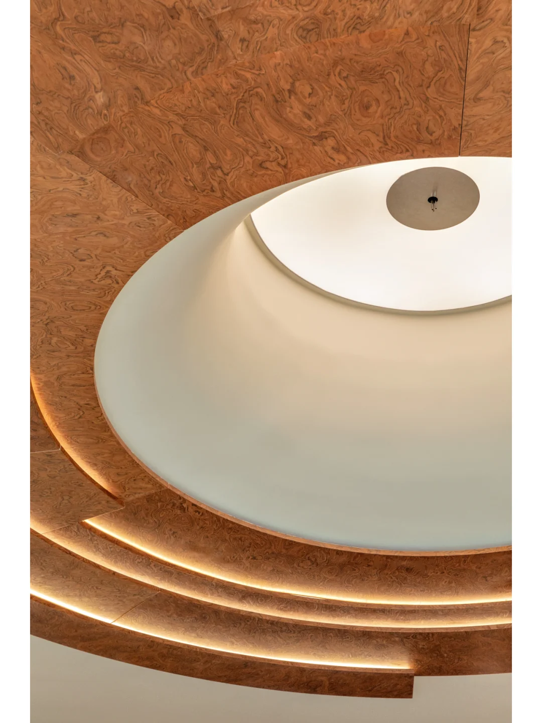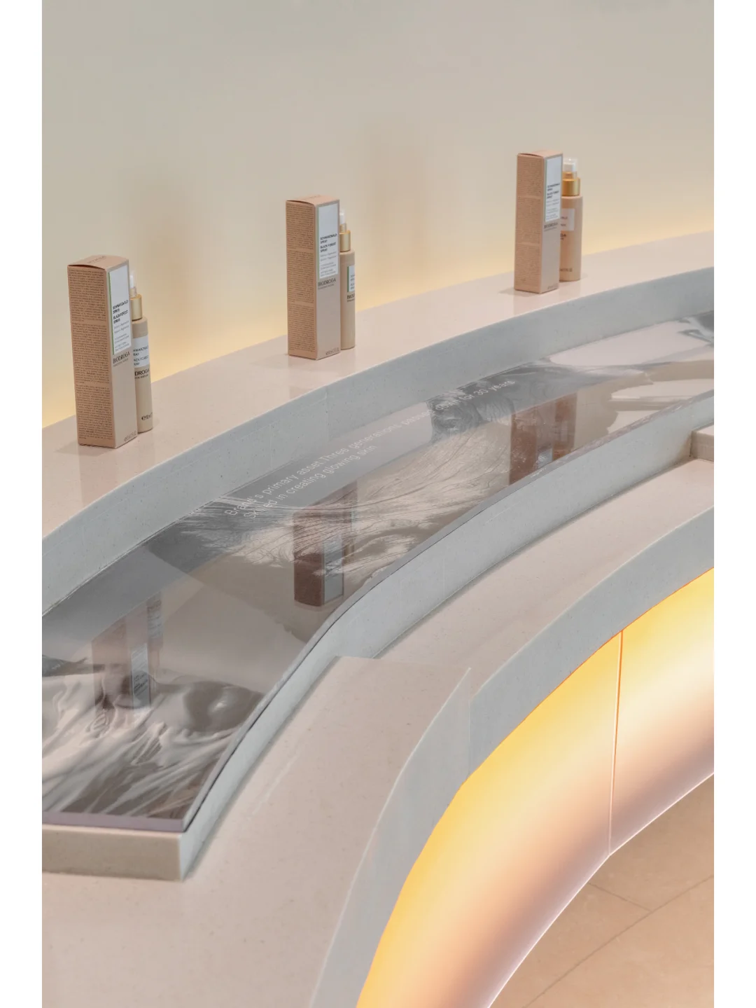 弧形半墙如同优雅曲线,将空间巧妙划分,其下方产品展示区沿着弧形半墙展开,形成一种自然且流畅的视觉感受。在布局上,采用分层式设计,将后区接待区相对独立,强调空间秩序,保证空间私密性,带来场所仪式感。勾勒出空间深度,也划分空间功能。