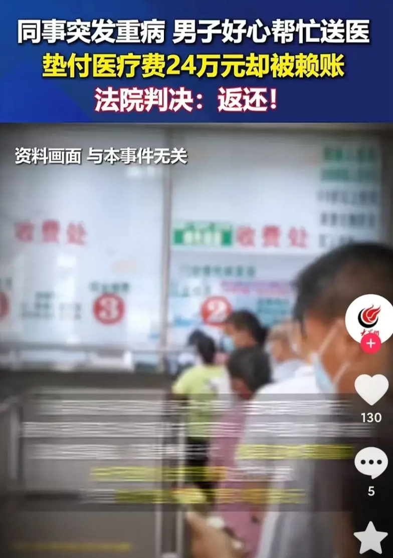 南通海安市,一男子在宿舍突然胸口疼痛。被同事送往医院急诊。因病情凶险,又转院至南通市区医院。急需手术时,男子妻子还未从老家赶到,同事应男子妻子请求,垫付医疗费24余万元。一个月后男子出院,拒不返还。同事无奈将男子夫妻诉至法院,法院这样判了!