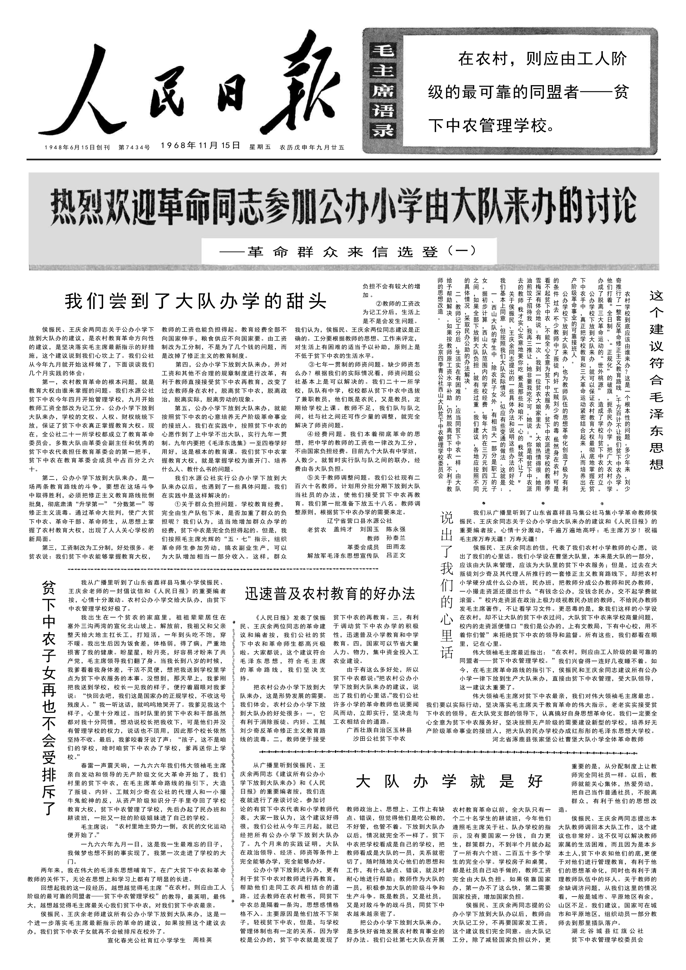 1968 年 11 月 14 日,《人民日报》发表了题为《建议所有公办小学下放到大队来办》的群众来信。次日,《人民日报》即开辟了《关于公办小学下放到大队来办的讨论》专栏。根据毛泽东的意见,这个专栏从 12 月 2 日第 7 期起,增加了 “关于城市小学及中学应当如何办”的讨论内容,涉及可否划归工厂和街道联办的问题。到 1976 年 8 月这个讨论专栏停办,共办了 197 期。