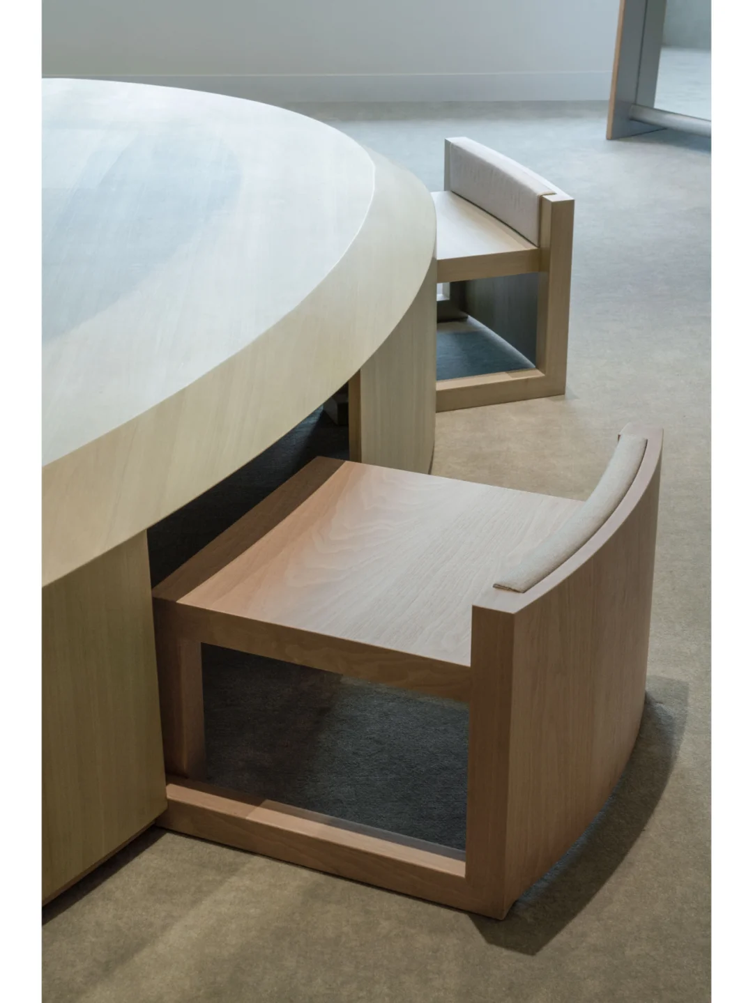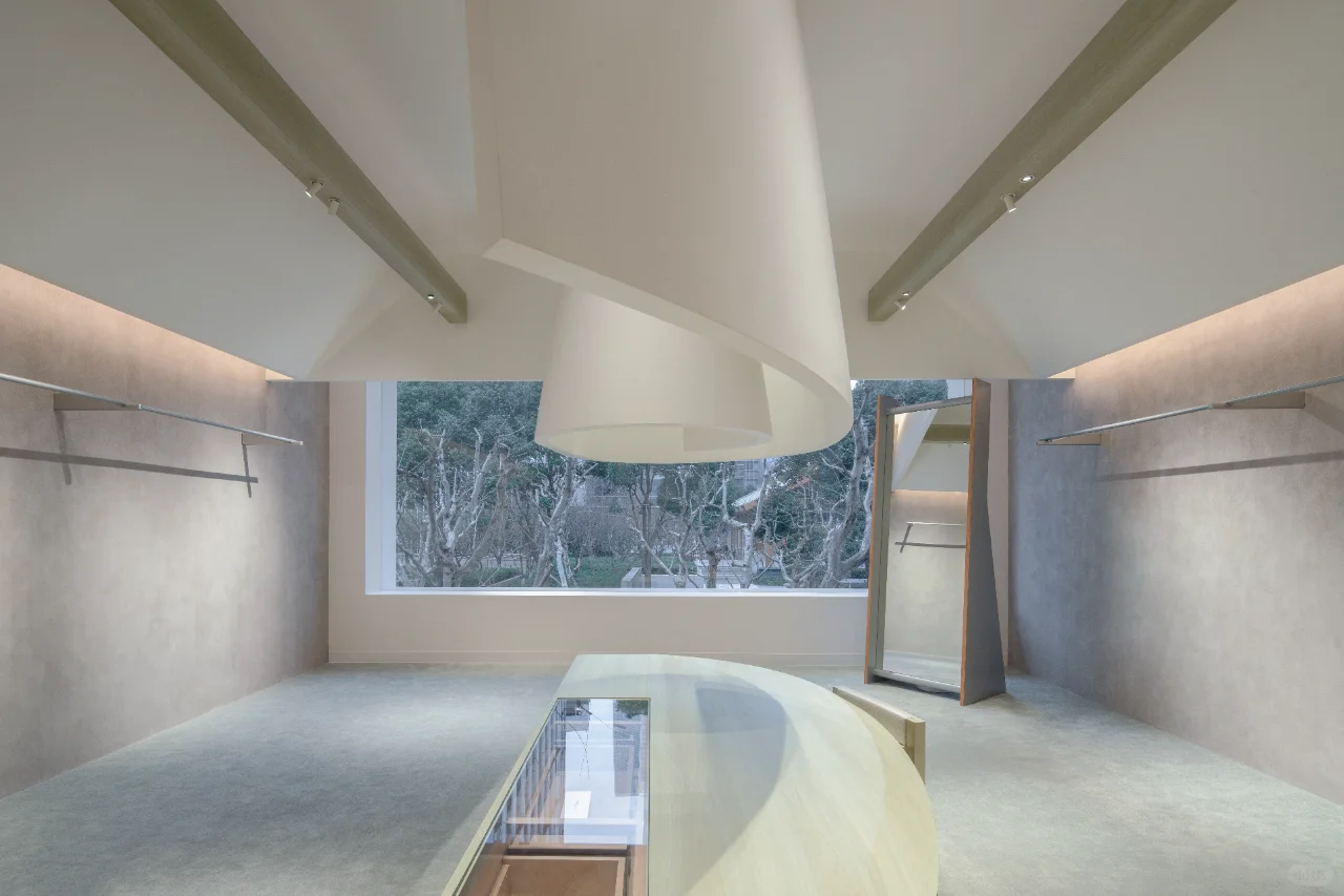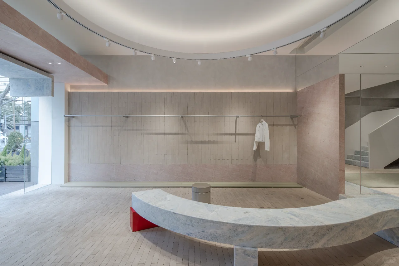 设计师借助构建来影响建筑的轮廓。一层空间的弧形石材道具占据了中心位。曲线自然勾勒,将空间轮廓映照得更加柔和,也调动着人的情绪感受。二层则将建筑坡屋顶的结构显性的植入到空间里,结构性的强烈减弱了街边店的感受。