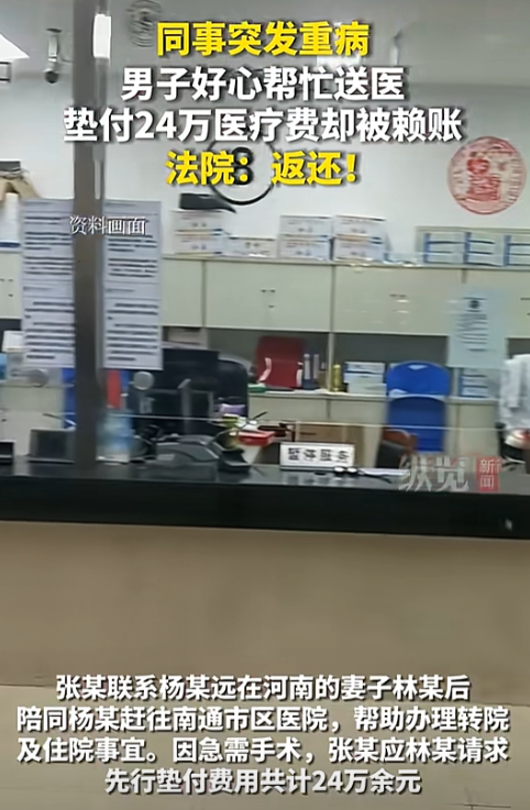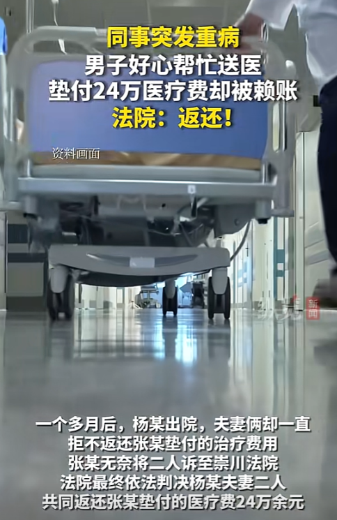 (信息来源:NXTV都市阳光2024年12月6日关于《无语住了!男子突发重病,同事好心送医并垫付24万医疗费却被赖!》的报道)