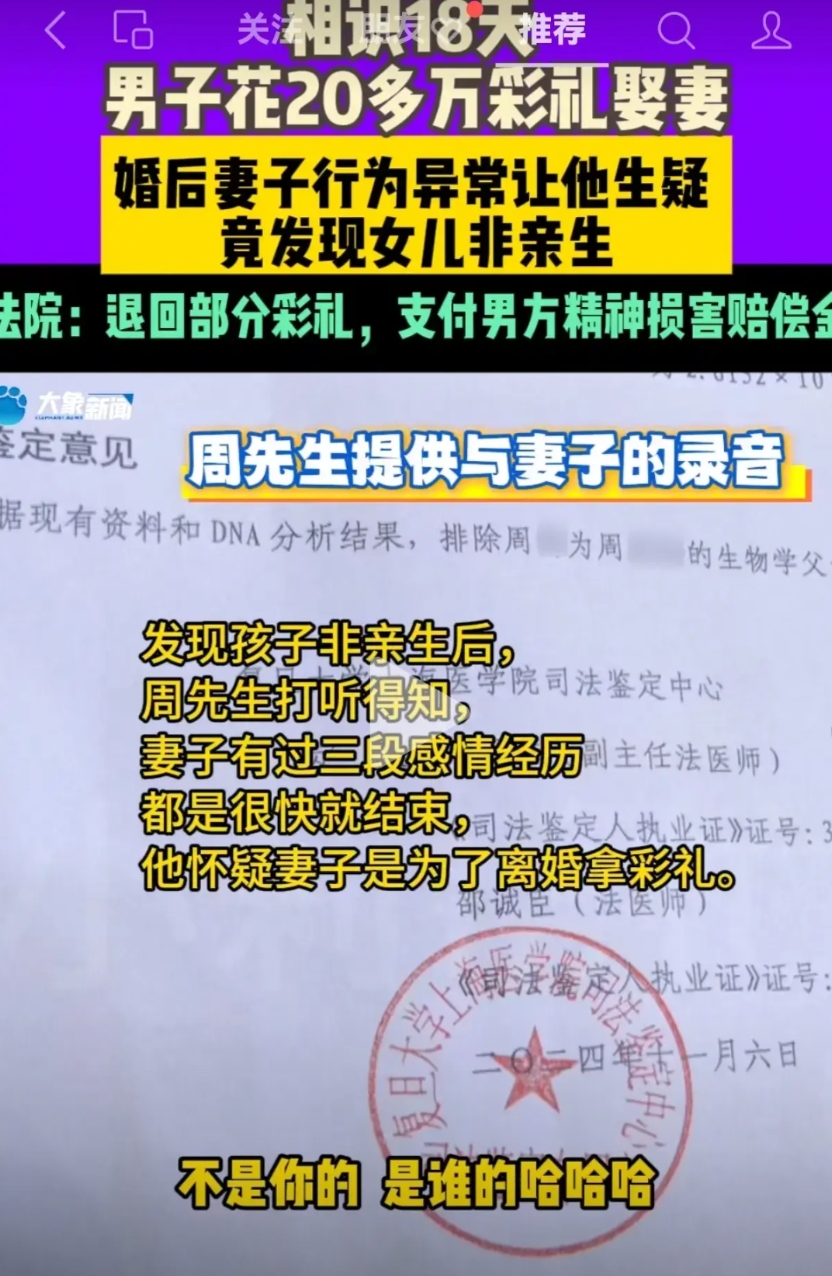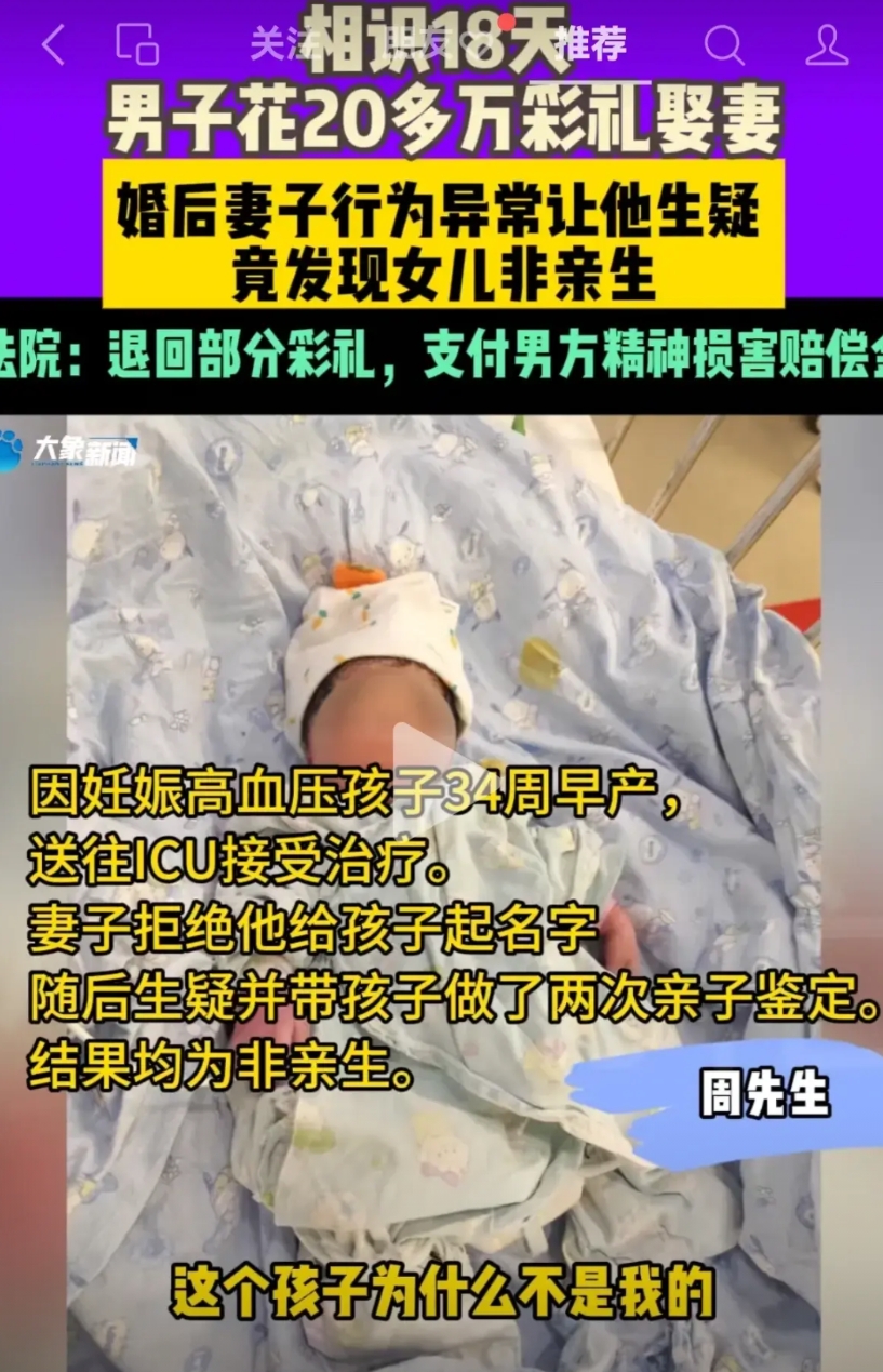 一男子相识 18 天,就花了 20 多万娶老婆,婚后发现妻子行为异常,亲子鉴定又发现孩子非亲生,女方曾有过三段短暂的婚姻关系,很难不让人怀疑是骗婚骗财。男子起诉了离婚,法院判决离婚,但是只能退回部分彩礼。男方真的是人财两空,精神倍受摧残,这种女的让男的对女性有更多的审视,也让更多未婚的男青年不敢结婚,太恐怖了这个社会。