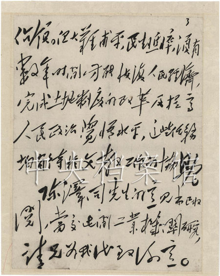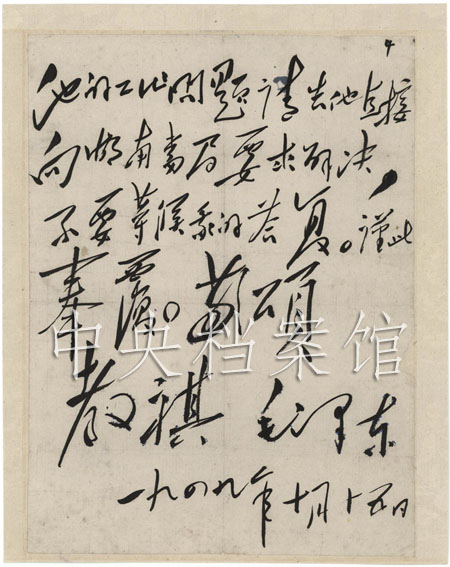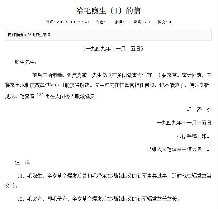 同日 复信毛煦生:“前后三函奉悉,迟复为歉。先生仍 以在乡间做事为适宜,不要来京。家计困难,在将来土地制度改 革过程中可能获得解决。先生过去在辎重营担任何职,记不清楚 了,便时尚祈见示。毛紫奇尚在人间否?”