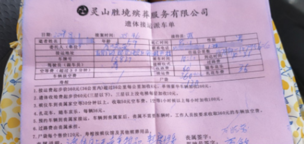 澄江县灵山胜境殡葬公司接下了这单业务,一辆殡仪车载着蔡先生的遗体,踏上了漫长的归途,沉浸在巨大悲痛中的家属并没有意识到,一张看似普通的派车单,背后隐藏着巨大的“坑”。