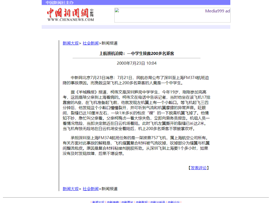 2000年,一名中学生乘坐飞往上海的航班时,惊恐地发现飞机的机翼上有一个缺口,随着飞机的升空,这个缺口逐渐扩大,最终竟然有一块铁皮从飞机上脱落...... (主要信源:原文登载于中国新闻网 2000年7月23日 关于“上航班机迫降:一中学生挽救200多名乘客”的报道) 在那个炎热的夏日午后,柯伟文坐在飞机的靠窗座位上,他的眼睛紧盯着窗外那片蔚蓝的天空,飞机开始加速,机身轻微地震动着,这是每次飞行前必经的程序。 可柯伟文的眉头却逐渐紧锁,他的目光凝固在飞机左翼的一个角落,飞机的状况在那一刻显得异常紧张。 原本平滑的机翼上,出现了一道细微的裂缝,就像是一张完美无瑕的画布上突然多了一道裂痕,这道裂缝在飞机加速的过程中不断扩张,仿佛有一股无形的力量在撕扯着机翼的结构。 所谓的异常,就是这种违背常规的破坏,它预示着潜在的危险,一种可能威胁到整个飞机安全的隐患。 当柯伟文看到一大块铁皮被强风卷走时,他的心跳瞬间加速,一种前所未有的恐惧和紧张席卷而来,他的手心开始冒汗,呼吸也变得急促。 在他的心中,那块脱落的铁皮不仅仅是一块金属,它是飞机完整性的象征,也是乘客安全的保障,柯伟文的心情如同被投入冰窟,他强迫自己保持冷静,转头看向身旁的父亲。 他的父亲,一位中年男子,面容沉稳,眼中透露出对儿子的信任,在飞机引擎的轰鸣声中,柯伟文用颤抖的手指指向窗外,父亲顺着他指的方向看去,脸色立刻变得苍白。 在那一刻,父子俩没有多余的交流,他们知道必须立即行动,柯伟文的父亲迅速按下了呼叫按钮,一位机组人员走了过来。 在紧张的氛围中,他们用尽可能平静的语气,将飞机的状况告诉了工作人员,工作人员的反应迅速而专业,他们立即通知了机长,并在确认情况后,启动了紧急预案。 机舱内的气氛变得紧张,乘客们被要求回到座位上,系好安全带,机组人员则在机舱内来回走动,检查各项安全措施,当飞机开始紧急迫降时,机舱内的气氛达到了高潮。 乘客们的脸上写满了惊恐和不安,有人紧握着扶手,有人闭上了眼睛默默祈祷,飞机的每一次颠簸都牵动着大家的心,那种生死未卜的感觉让每个人的心情都如悬在刀尖上。 那块巨大的铁皮迅速脱落,可能会对飞机的空气动力学性能造成严重影响,它不仅会破坏机翼的形状,还可能导致飞机失去平衡,甚至在空中解体。 当飞机最终安全降落在白云机场,乘客们的心情从极度的恐惧转变为深深的庆幸,他们互相拥抱,有的人流下了感激的泪水。 得知真相后,乘客们对柯伟文和他的父亲充满了感激,他们的行为被看作是英雄般的壮举,专家们对这一事件进行了详细的分析,他们指出,飞机的材料缺陷是导致这次事故的主要原因。 他们强调,在飞行中遇到此类情况,紧急迫降是最正确的选择,它避免了可能发生的灾难性后果,柯伟文凭借一己之力救下了200多名乘客,他的名字成为了勇敢和冷静的代名词。 乘客们对他充满了敬意,他们的眼神中充满了感激和敬佩,在这场与死神的较量中,柯伟文不仅展现了个人的勇气,也证明了在危机面前,人的智慧和决断能够扭转命运。