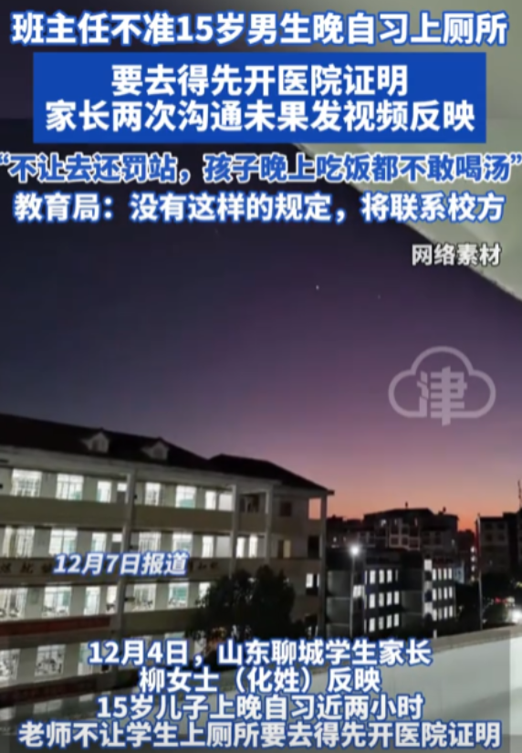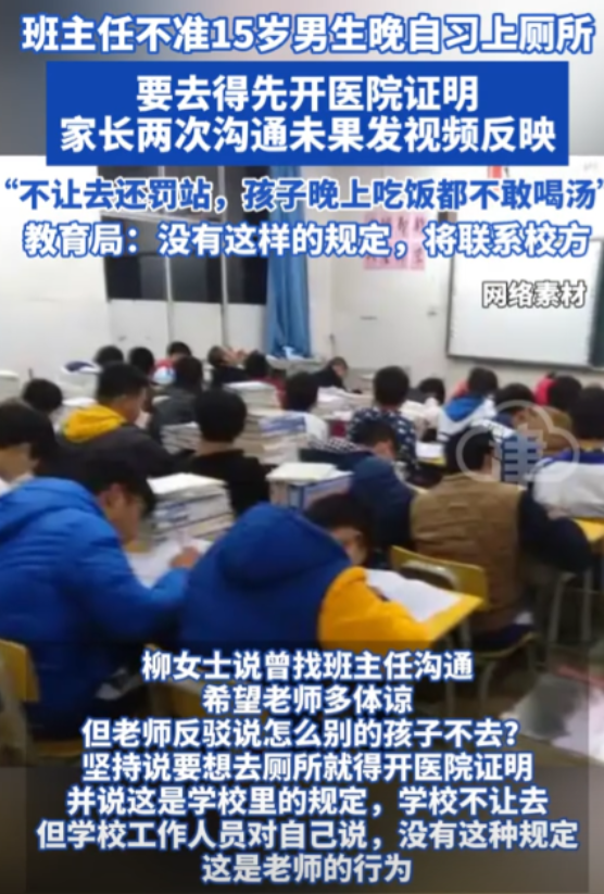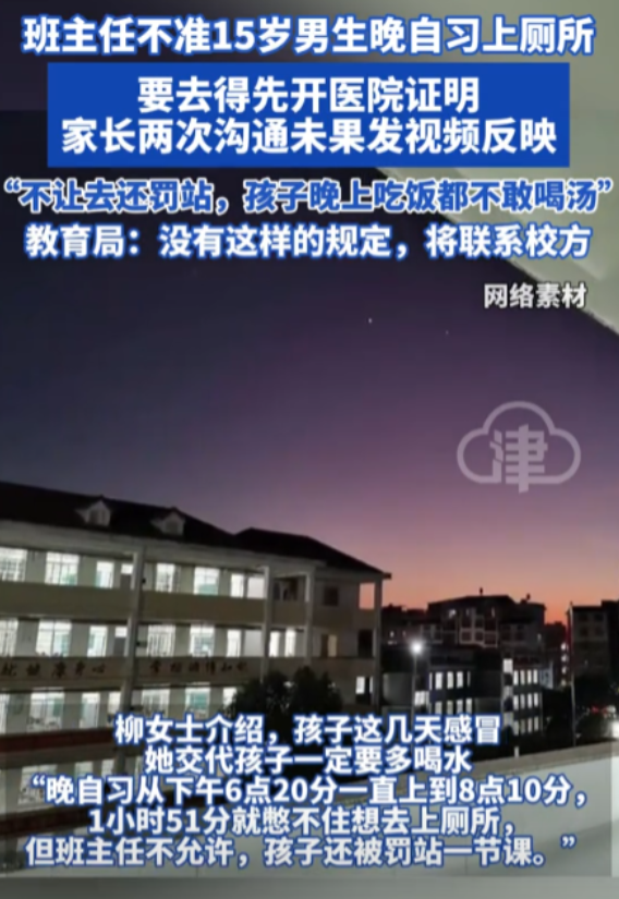 那么对于此事,你们有什么看法呢?有没有在上课的时候,被老师拒绝的情况呢? 信息来源:津云2024年12月8日《班主任不准15岁男生晚自习上厕所,要去得先开医院证明, 家长两次沟通未果发视频反映!教育局:没有这样的规定,将联系校方》